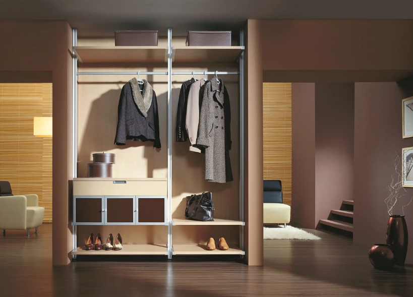 Las barras de combinación están disponibles para construcciones de esquina. La parte larga se usa en ellos para colgar abrigos de piel, abrigos, impermeables largos, ropa exterior para niños, chaquetas y chaquetas se colocan en la sección superior corta. Paraguas y bolsas se encuentran a continuación. Colgaba, montada perpendicular a la pared, adecuada para armarios estrechos, de hasta 45 cm, y las estructuras deslizantes de perchas también se colocan allí.