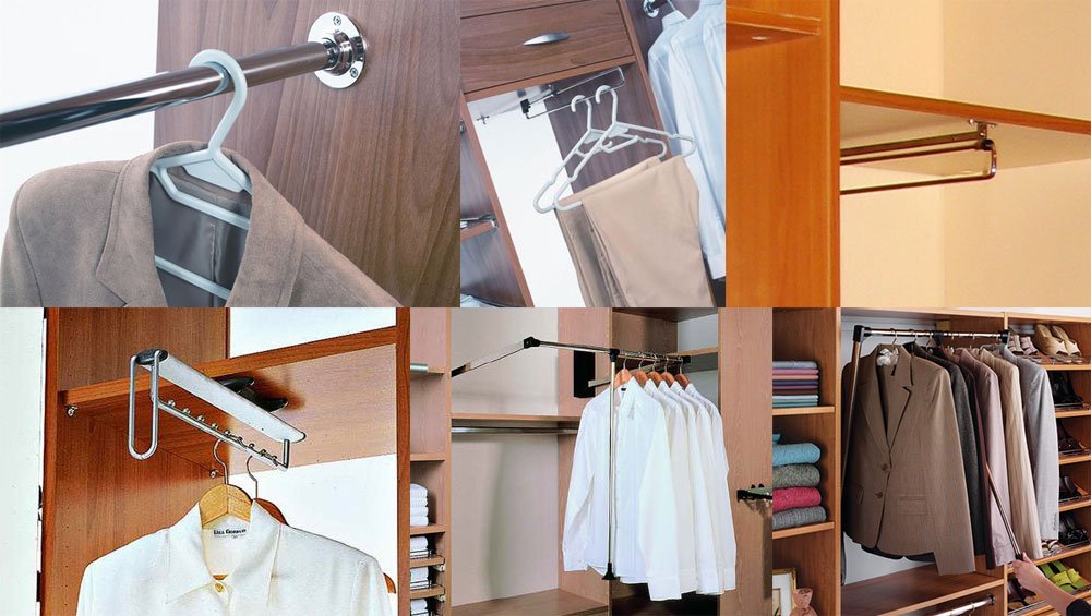 Estos artículos generalmente están hechos de fuertes tubos huecos, diseñados para colocar varias prendas de vestir en los hombros, perchas de varias configuraciones: abrigos, blusas, pantalones, faldas, etc. Una barra ordinaria o varias, montadas en gabinetes con un ancho de 65 cm, esta distancia es suficiente. para colgar los hombros, sin obstaculizar el progreso de las puertas correderas.
