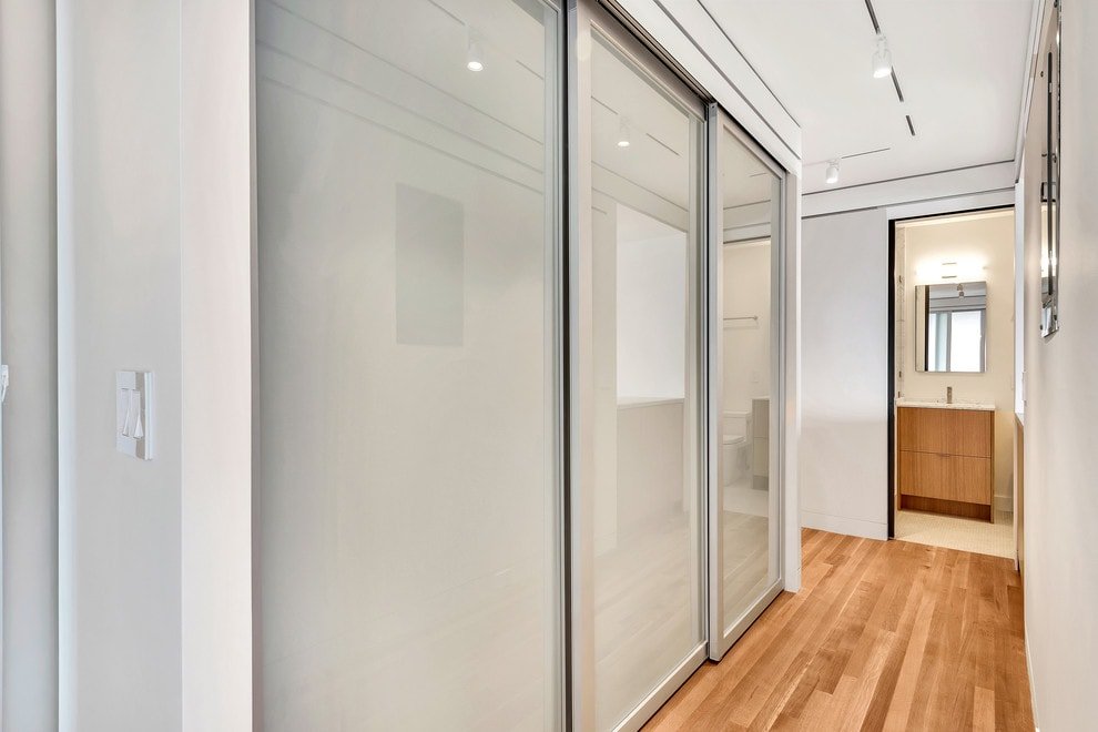 alta tecnología: vidrio esmerilado, metal brillante, muchos espejos, las puertas solo están corredizas;