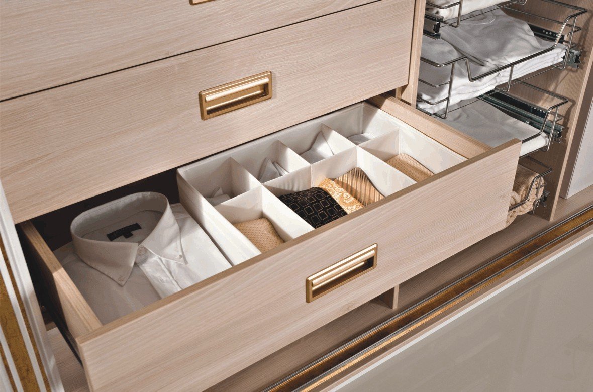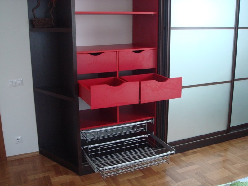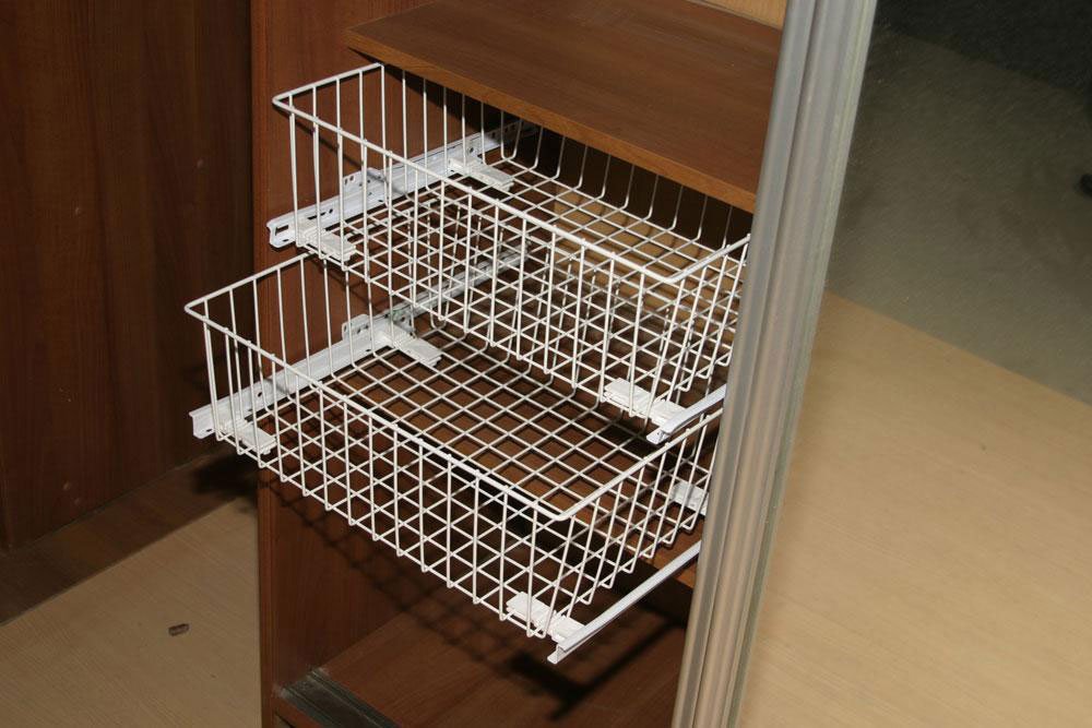 Puede haber muchas cajas: para determinar qué hay en cada una de ellas, una pegatina con una imagen o inscripción correspondiente está pegada a la parte visible. Las cestas son generalmente de malla o tejidas, hechas de plástico, metal, ratán, etc. Aquí almacenan calcetería, ropa interior, cuello, pañuelos en la cabeza, y varias prendas de punto. Los sombreros también se apilan en cajas.