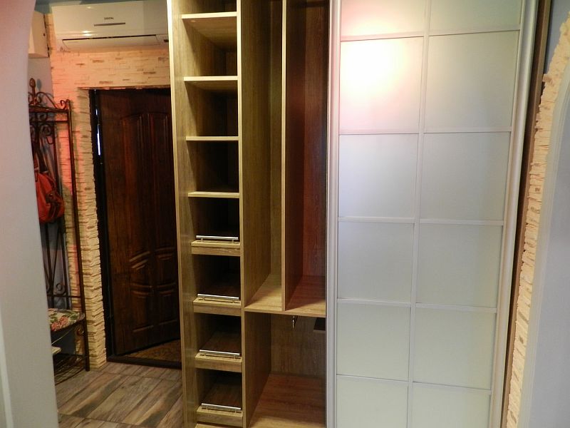 Los apartamentos de Khrushchev se caracterizan por unos estrechos anteriores que tienen techos relativamente bajos, unos 240 cm. El armario empotrado es muy pequeño, de diseño muy minimalista. El producto se hace estrecho, de pequeño tamaño, el espacio disponible se expande ligeramente con la ayuda de superficies de espejo, estantes abiertos, iluminación decorativa y funcional.