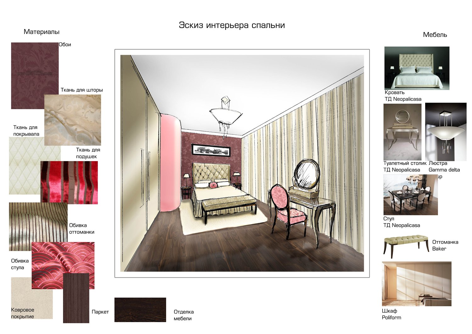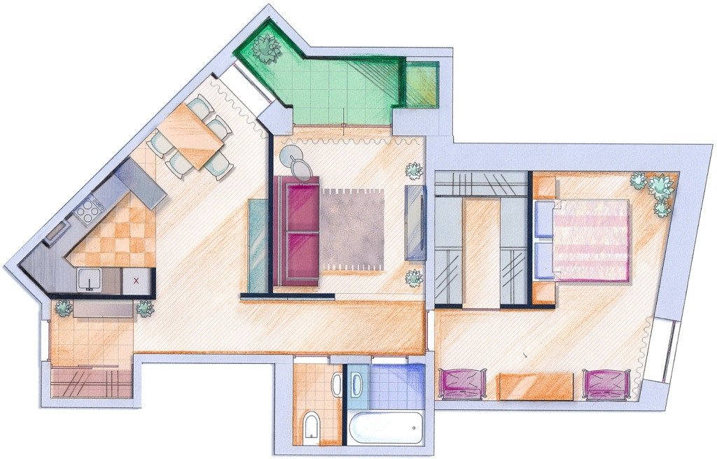 Proyecto de diseño simple y económico, pero a la vez funcional e informativo. Ayuda a sistematizar el proceso de reparación y determinar el estilo principal del interior, permite mirar la habitación desde un lado, determinar qué falta y qué se puede complementar o corregir. Una característica distintiva de este tipo de proyecto es la falta de especificidad: no hay instrucciones claras sobre la textura o los tonos, la disposición de los muebles es aproximada, todos estos detalles se indican en el boceto para comprender el concepto general.