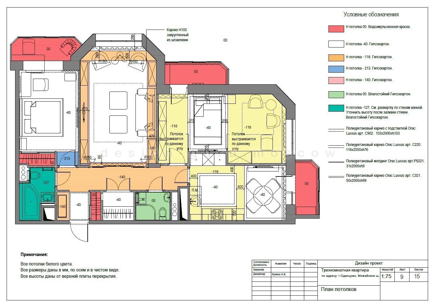 Puede haber varios documentos de este tipo, de acuerdo con la cantidad de opciones de disposición de muebles. El cliente debe aprobar uno que sea más adecuado. Cuando el cliente y el diseñador llegaron a una opinión común sobre la disposición de los muebles y los detalles de la reurbanización, es necesario arreglar toda la información para el equipo de constructores que realizará estos trabajos. El plan es detallado e incluye: