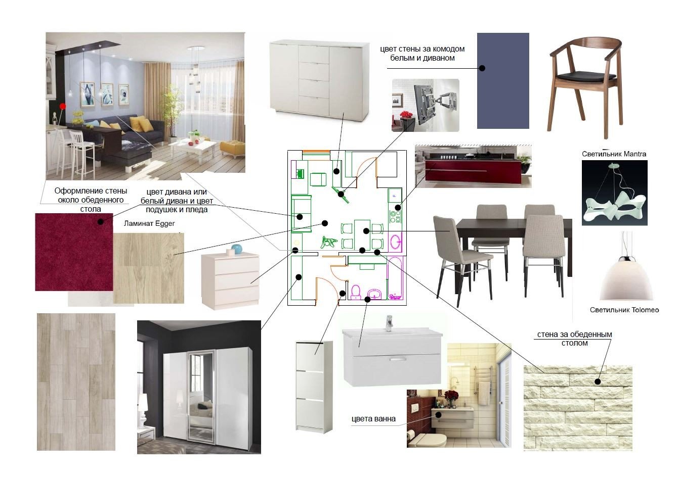 Proporciona la visibilidad del proyecto para una mejor percepción.Para ayudar al cliente a imaginar el futuro interior, el diseñador puede crear un collage tanto en papel como en formato electrónico. Se utilizan varias imágenes, las más similares a las que se usan en un proyecto real. De esta manera, el cliente puede usarlo cuando le explique al diseñador sus ideas, cualquier imagen servirá: fotos, dibujos personales o copiados, recortes de revistas o periódicos son muy claros. En el futuro, estos ejemplos pueden usarse en el collage estilístico final.