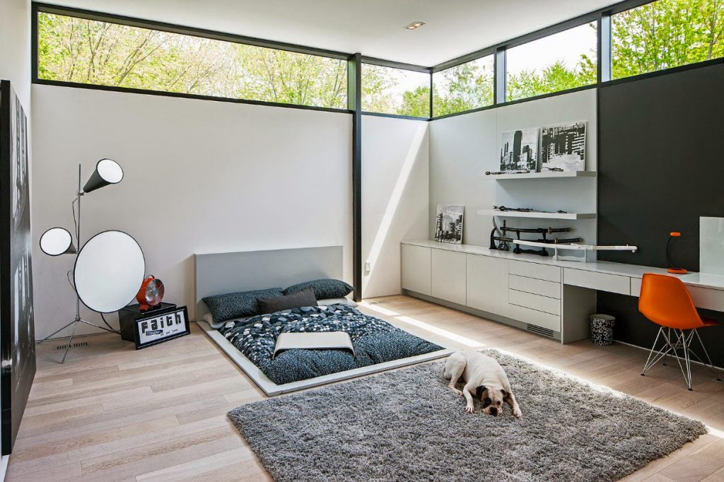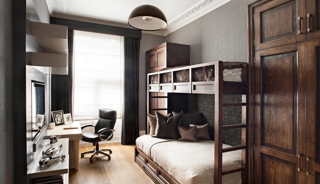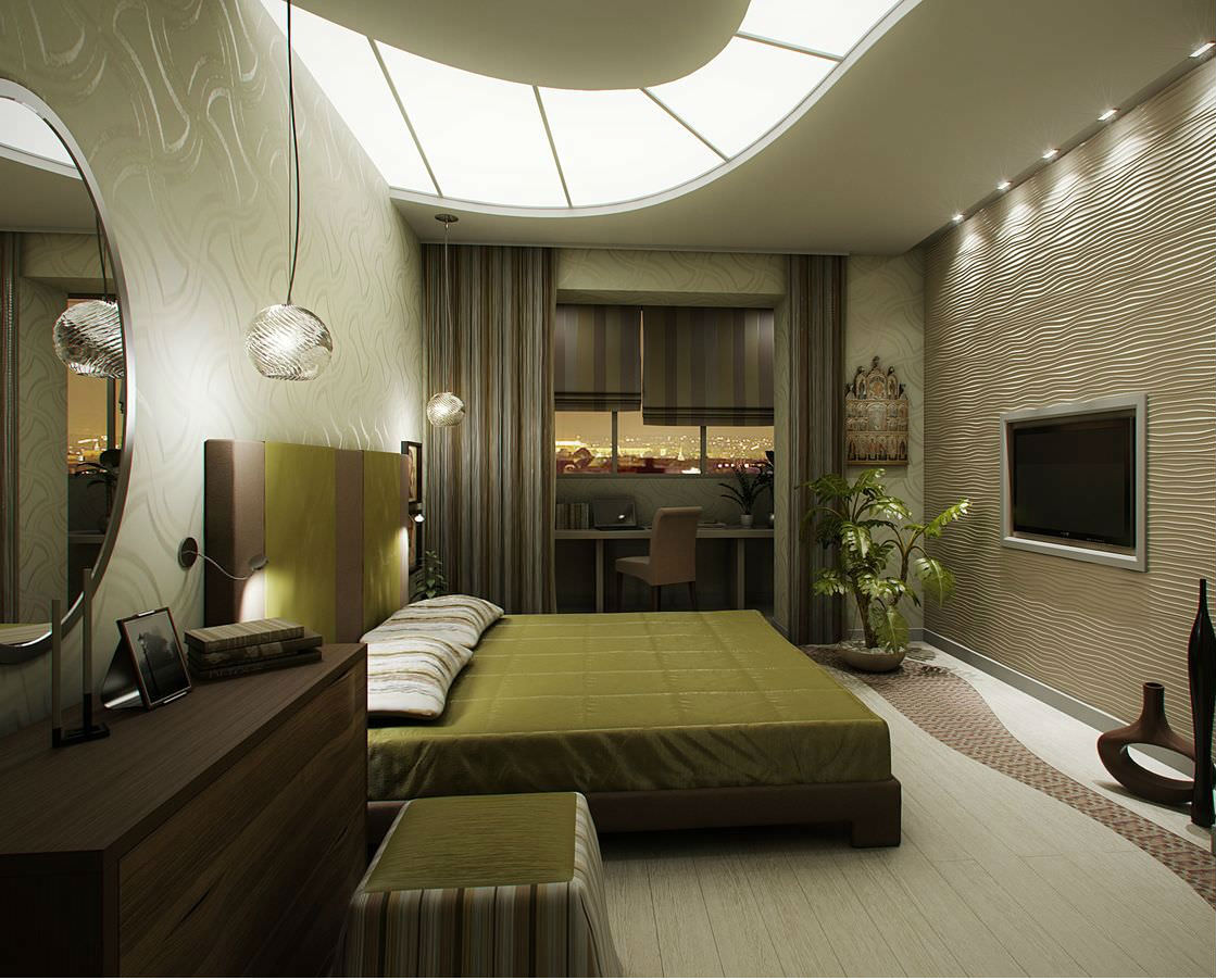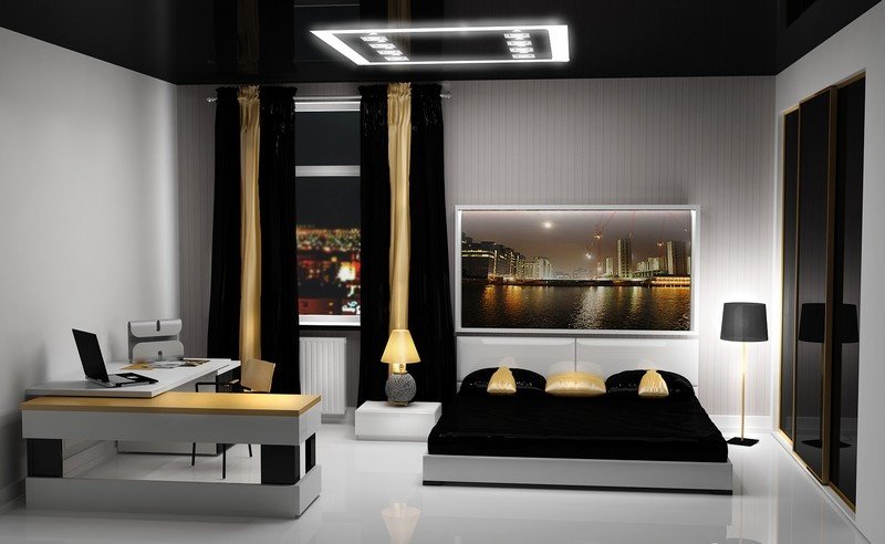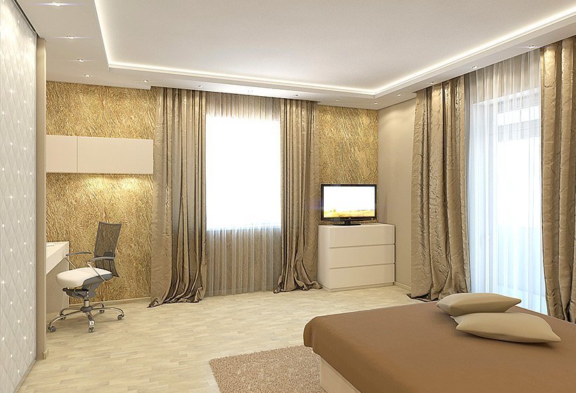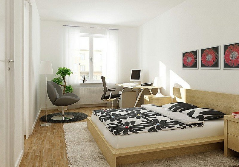 Por lo general, la cama y el dormitorio en sí ocupan la mayor parte del espacio, y la oficina alcanza su mejor cuarto. Si la habitación tiene forma rectangular, se divide condicionalmente en tres áreas iguales, dos de las cuales ocupan un lugar de descanso. La zonificación se puede organizar utilizando varios métodos: