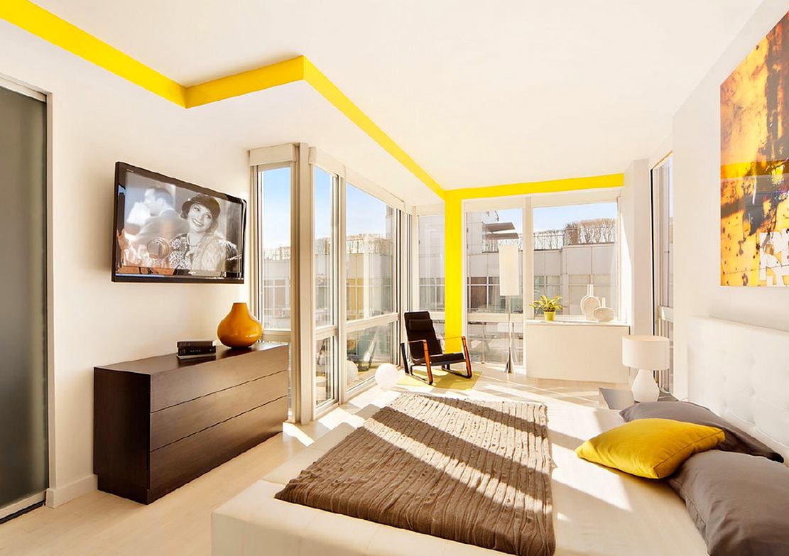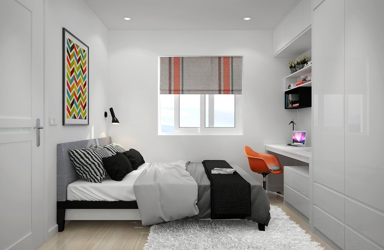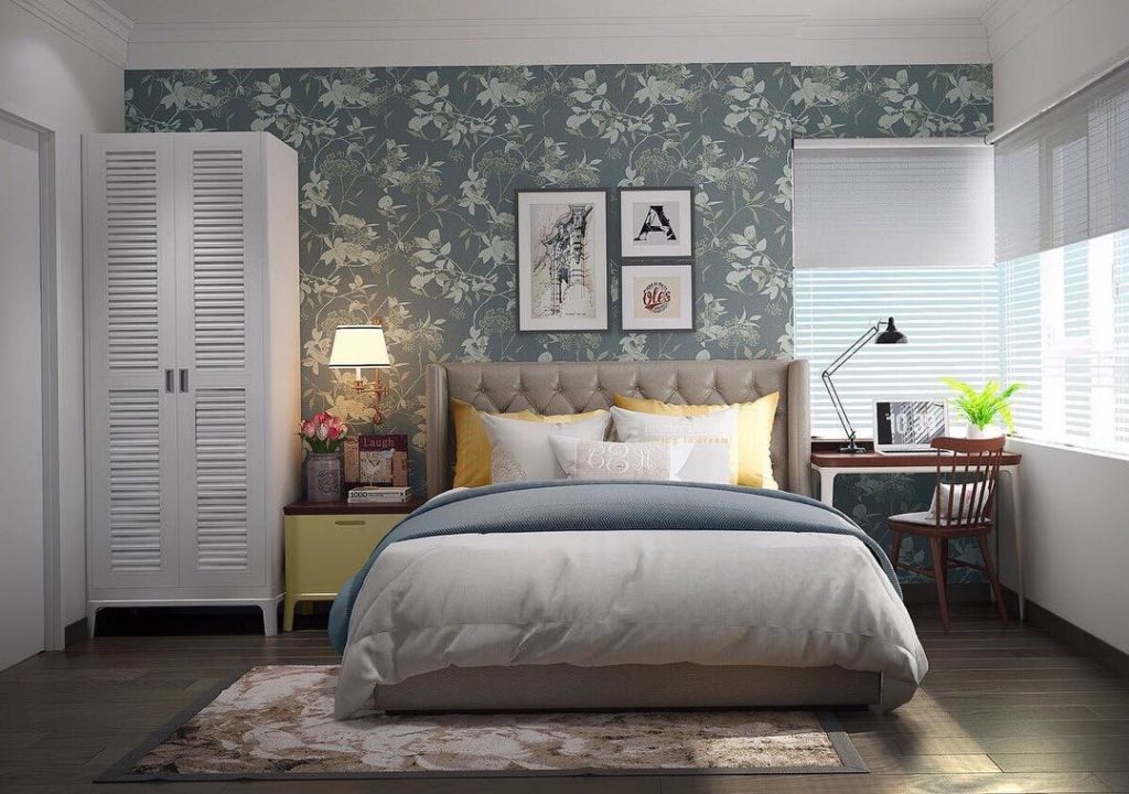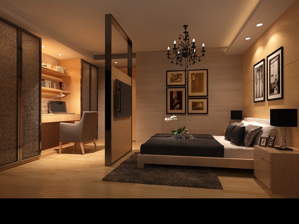 Por lo general, la cama y el dormitorio en sí ocupan la mayor parte del espacio, y la oficina alcanza su mejor cuarto. Si la habitación tiene forma rectangular, se divide condicionalmente en tres áreas iguales, dos de las cuales ocupan un lugar de descanso. La zonificación se puede organizar utilizando varios métodos: