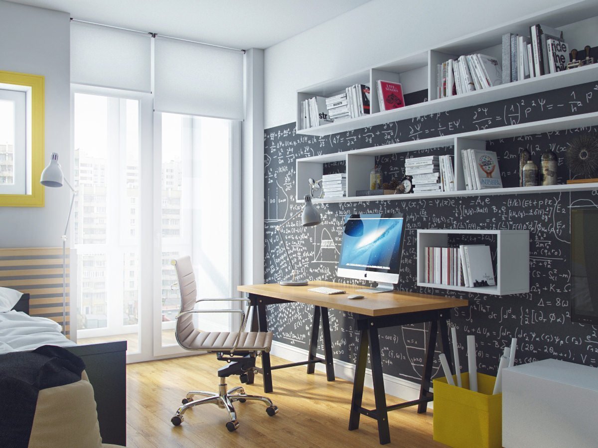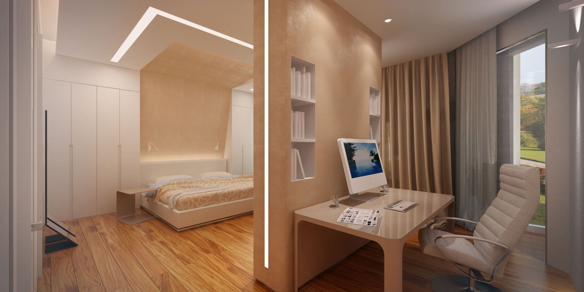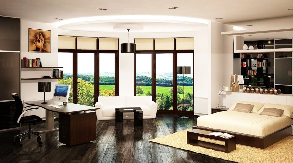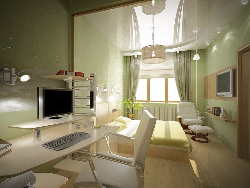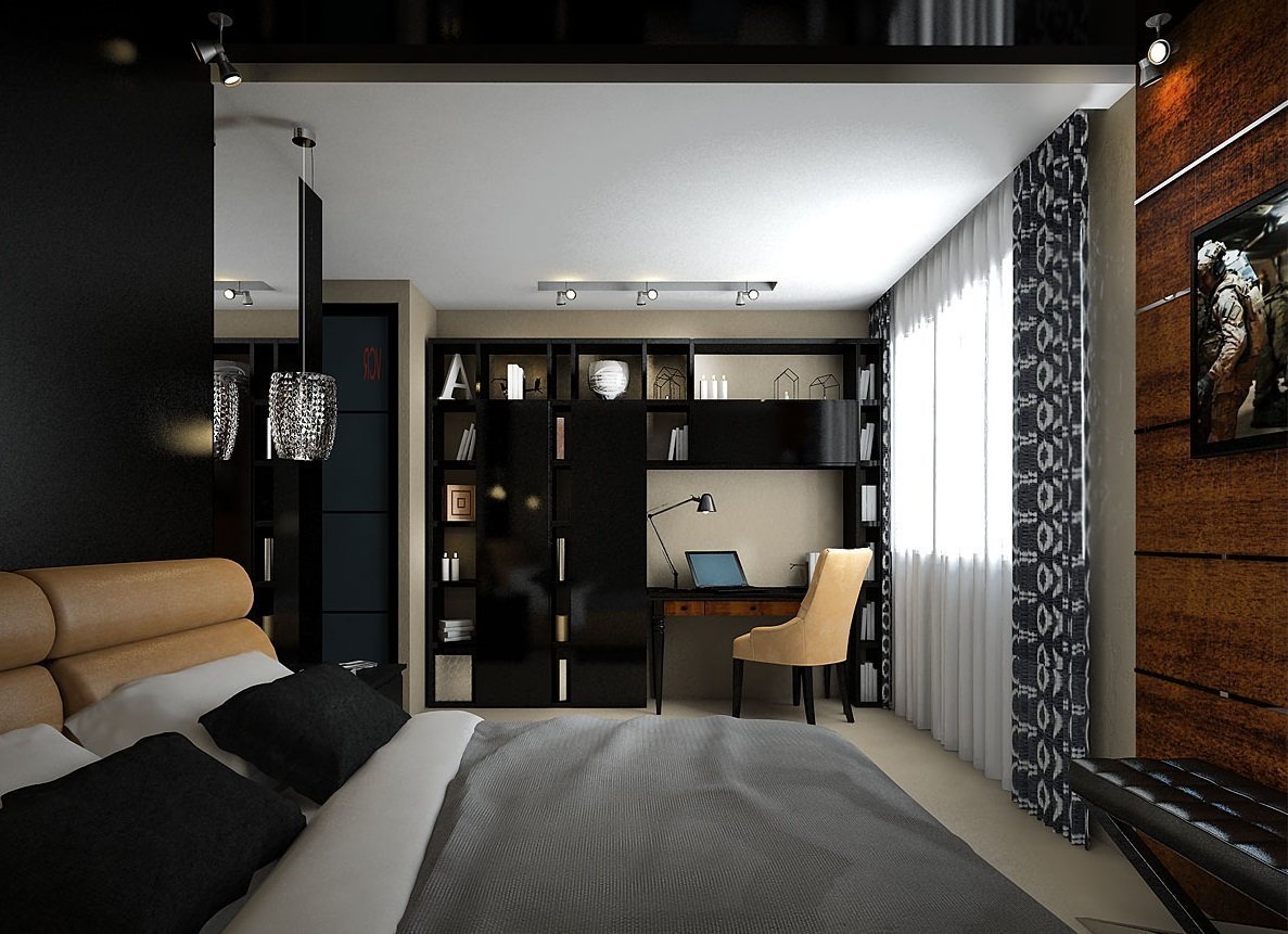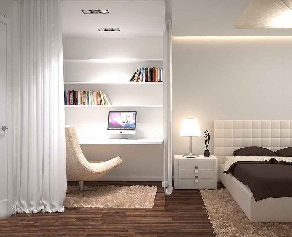 La opción más común es colocar una oficina junto a la ventana y el área para dormir en la parte posterior de la habitación. Durante el día puede hacer negocios con luz natural, y por la noche las ventanas se cierran con cortinas y se instala una partición móvil. Lo principal en este diseño: no privar al dormitorio de la luz solar. De lo contrario, se volverá "frío" e incómodo. El espacio mínimo necesario para el trabajo se coloca en la sala de estudio: una mesa de computadora, una silla, estantes colgantes o bastidores con libros y objetos necesarios para la actividad. Si el área lo permite, entonces, en el área de trabajo, adicionalmente colocan un sofá o un par de pufs suaves en caso de que desee relajarse, y es inconveniente colocar una cama en el medio del día para estos fines. Todos los elementos de los muebles deben estar dispuestos de forma compacta y económica.