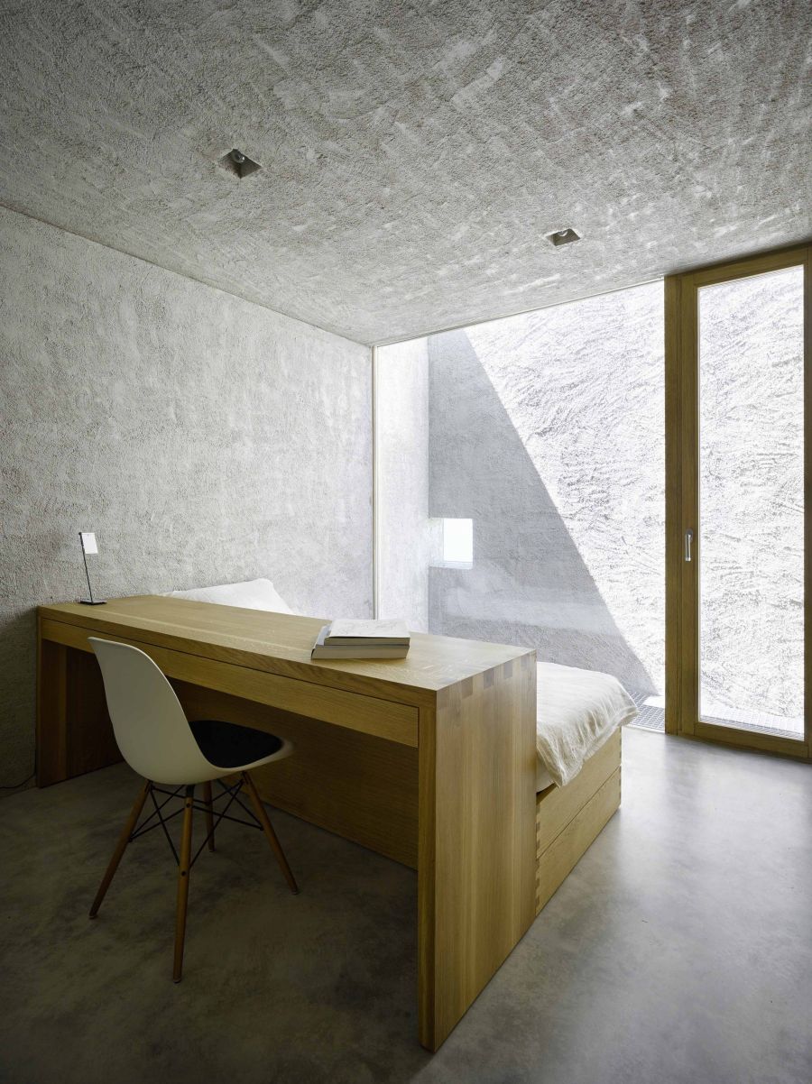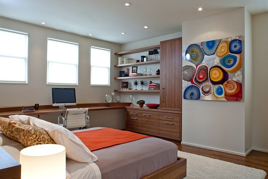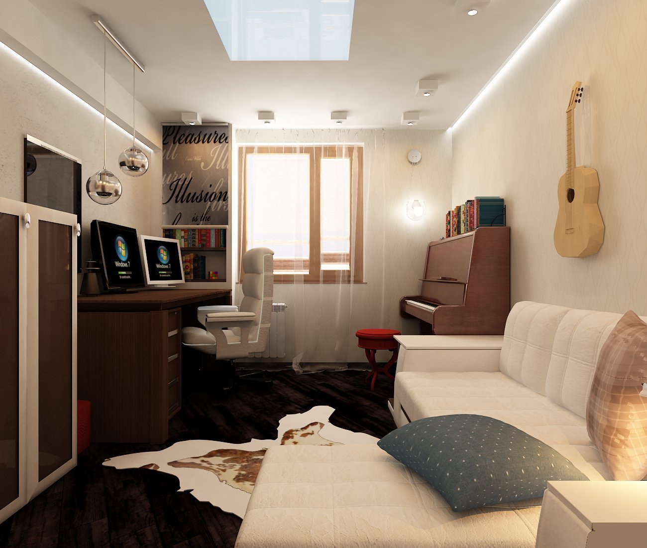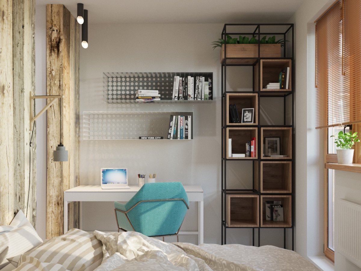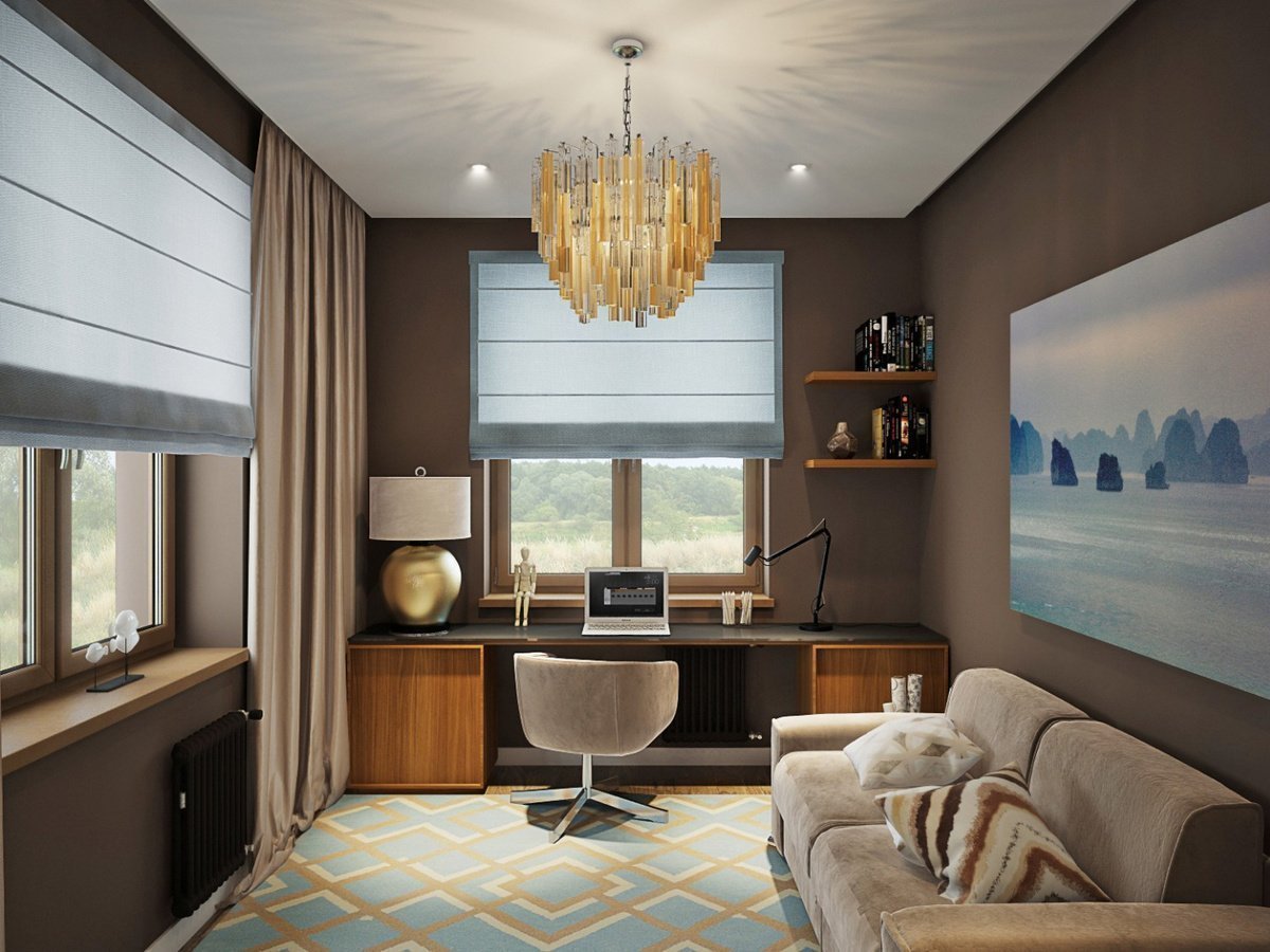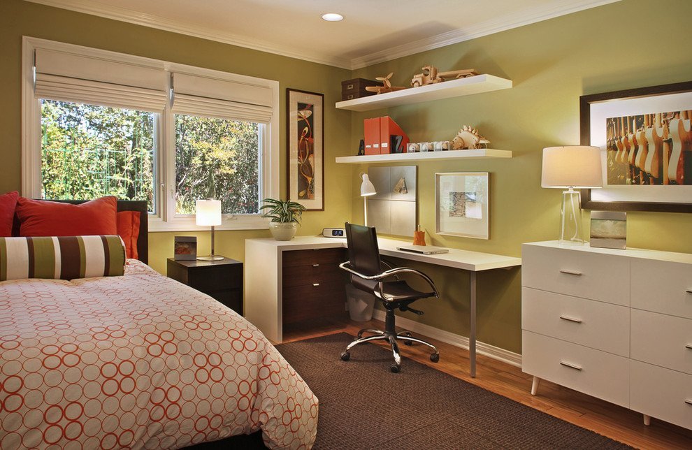 La opción más común es colocar una oficina junto a la ventana y el área para dormir en la parte posterior de la habitación. Durante el día puede hacer negocios con luz natural, y por la noche las ventanas se cierran con cortinas y se instala una partición móvil. Lo principal en este diseño: no privar al dormitorio de la luz solar. De lo contrario, se volverá "frío" e incómodo. El espacio mínimo necesario para el trabajo se coloca en la sala de estudio: una mesa de computadora, una silla, estantes colgantes o bastidores con libros y objetos necesarios para la actividad. Si el área lo permite, entonces, en el área de trabajo, adicionalmente colocan un sofá o un par de pufs suaves en caso de que desee relajarse, y es inconveniente colocar una cama en el medio del día para estos fines. Todos los elementos de los muebles deben estar dispuestos de forma compacta y económica.