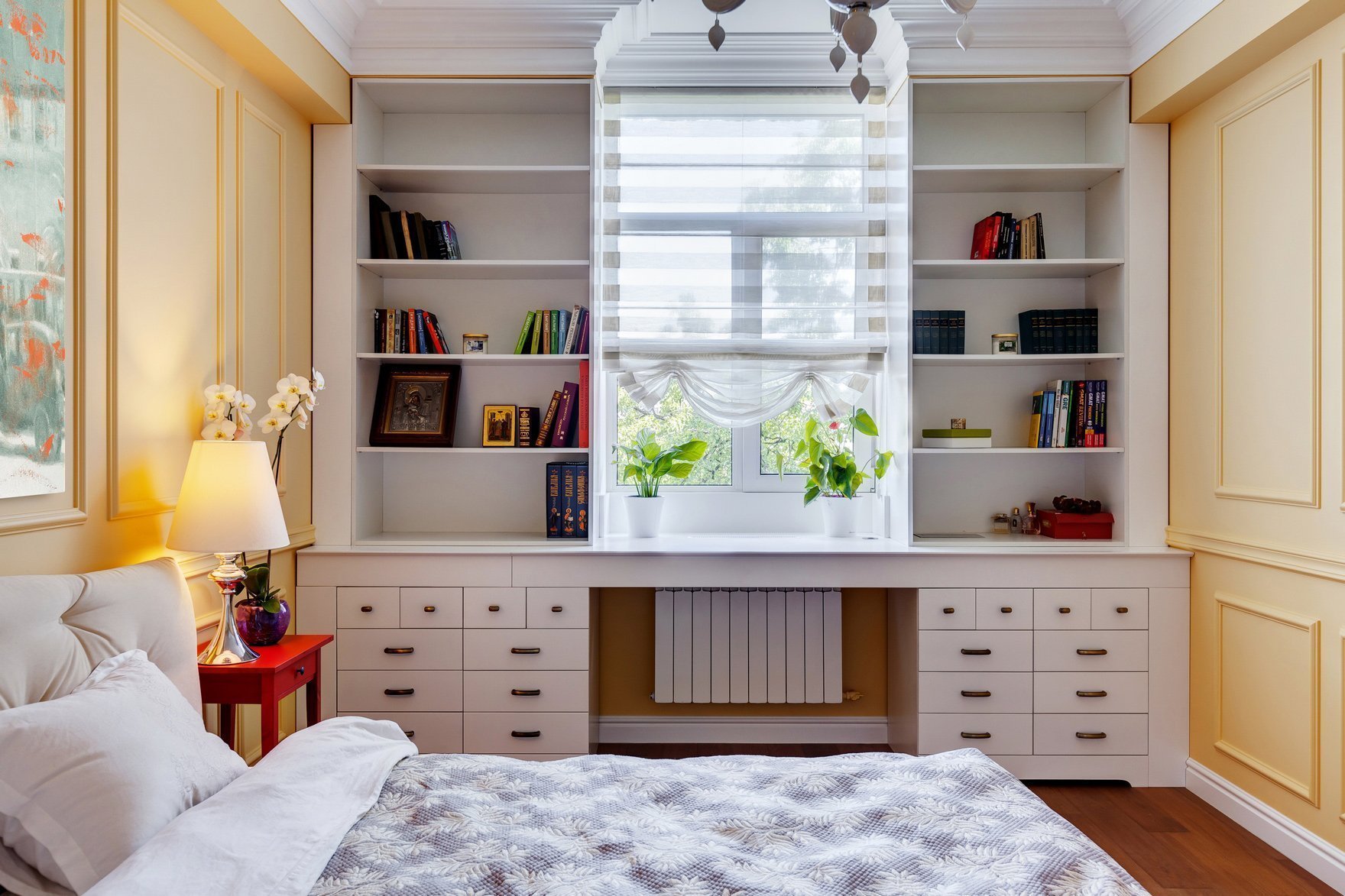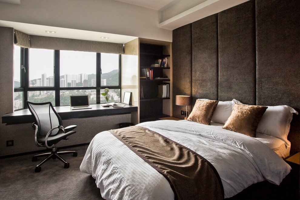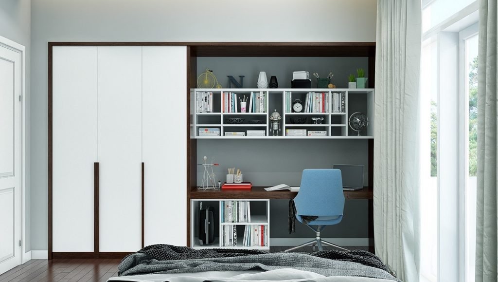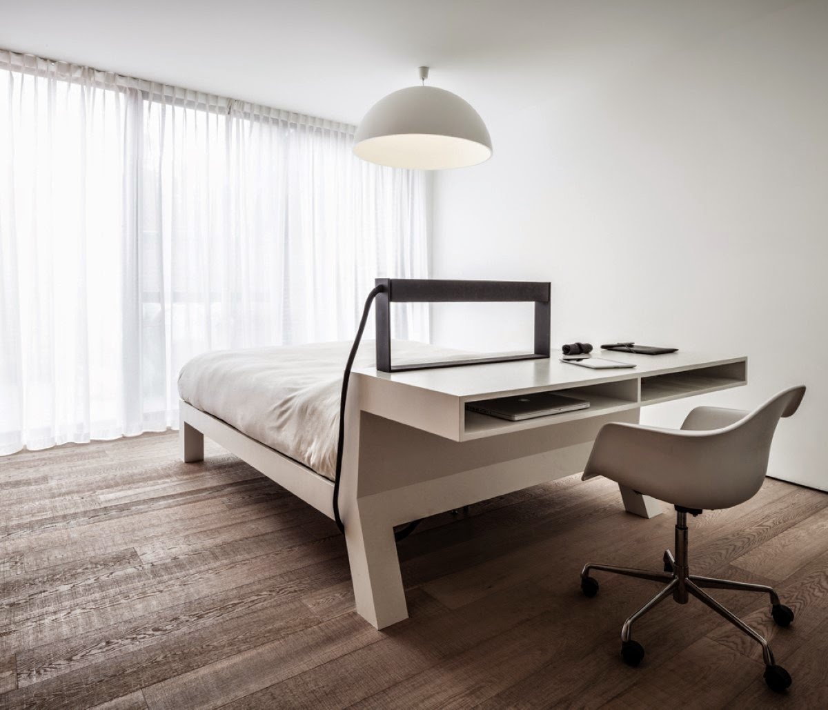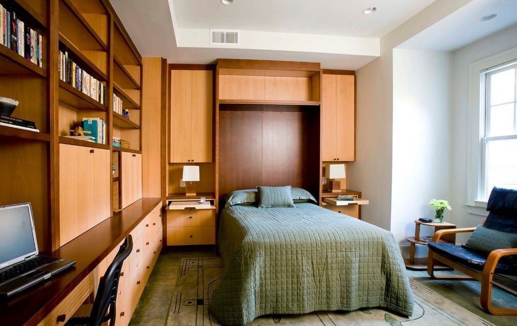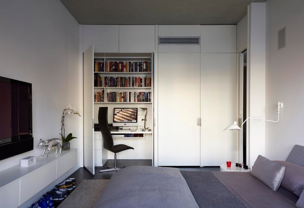 El área de trabajo siempre está asociada con muebles de oficina funcionales, que no tienen lugar en el dormitorio. En esta situación, tienes que encontrar un compromiso.En ambas zonas, el mobiliario debe ser lo más neutral y versátil posible, pero sin la sensación de una "casa del tesoro", que a menudo se encuentra en las oficinas. El conjunto mínimo incluye una cama para dormir, un armario, mesitas de noche o una cómoda, un lugar de trabajo, una silla, una estantería. Opciones de aspecto original con camas transformadoras. Por la noche, la litera se despliega, y durante el día se ensambla de forma compacta y se convierte en un acogedor sofá. Por lo tanto, será posible matar dos pájaros de un tiro: liberar espacio para el movimiento sin interferencias, organizar un rincón acogedor para descansar un día. En los apartamentos con ventanas panorámicas, la cama generalmente tiene cabecera a las ventanas. El diseño especial del modelo le permite plegarlo en un sofá de dos lados con un respaldo común. Tal solución no estándar permite organizar dos zonas independientes a la vez: para ver las bellezas circundantes y para beber té con los invitados. Una maravillosa oportunidad para encontrar su rincón tranquilo para quienes gustan de la privacidad. El gabinete y el estante se pueden combinar en un diseño complejo. Algunos modelos proporcionan tanto relleno interno como estantes en la parte posterior, que no se debe mover a la pared.