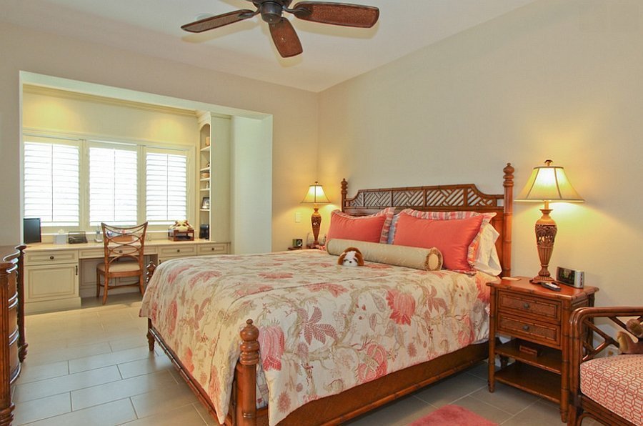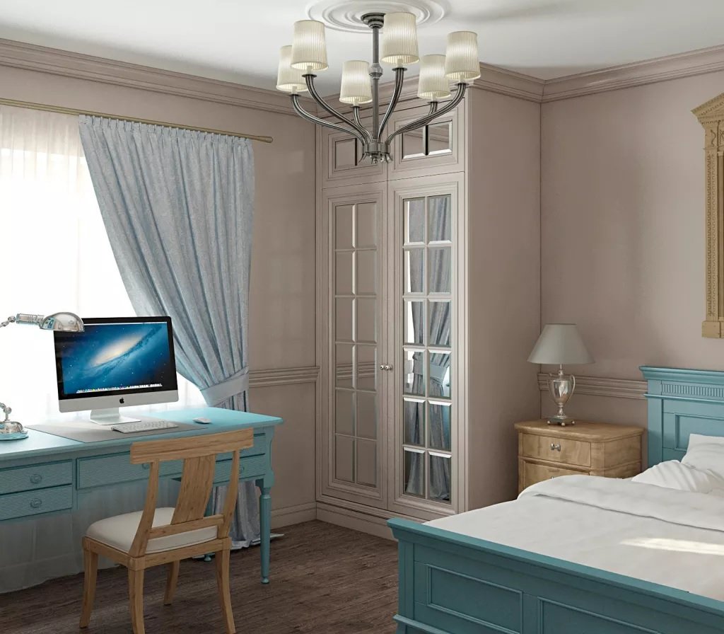 Si el gabinete del dormitorio está en el lado sombreado y el sol rara vez mira hacia la habitación, entonces el déficit de luz se compensa con las cálidas sombras del espectro: