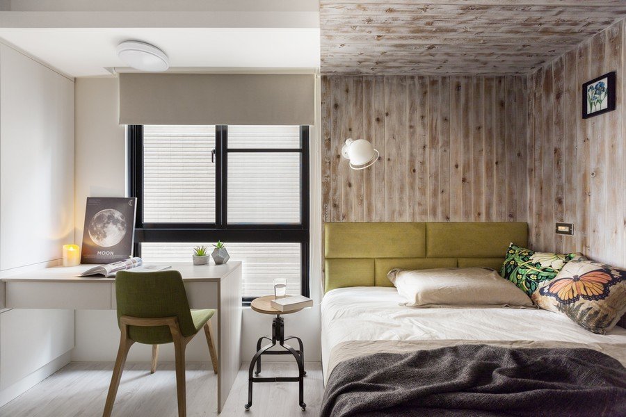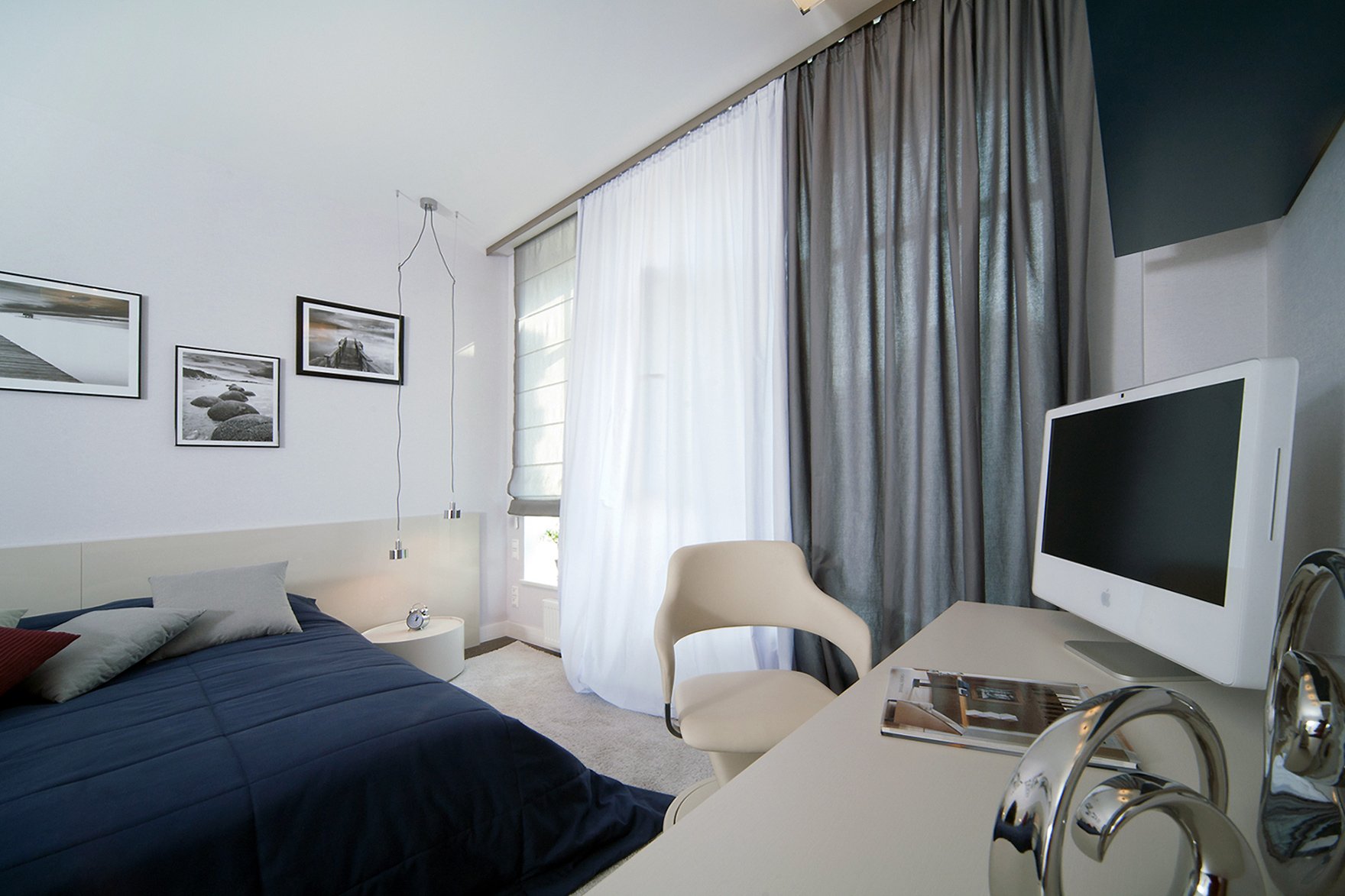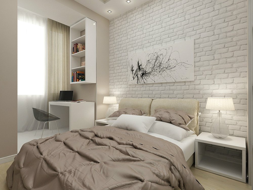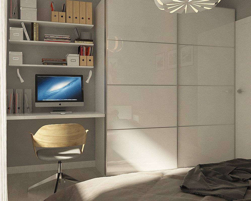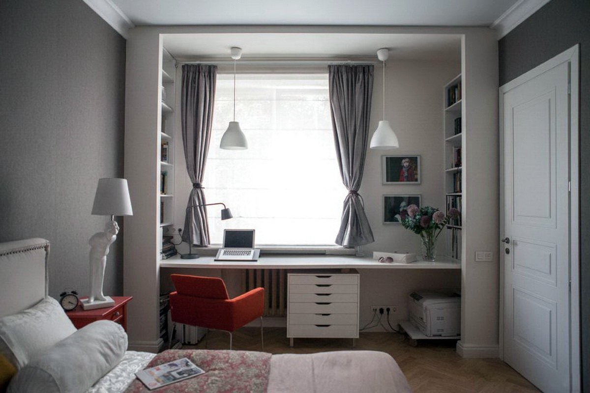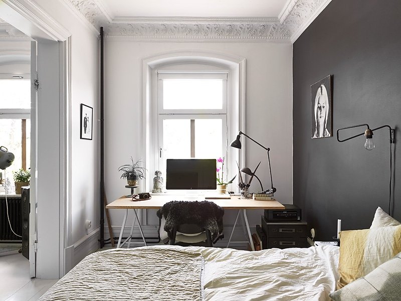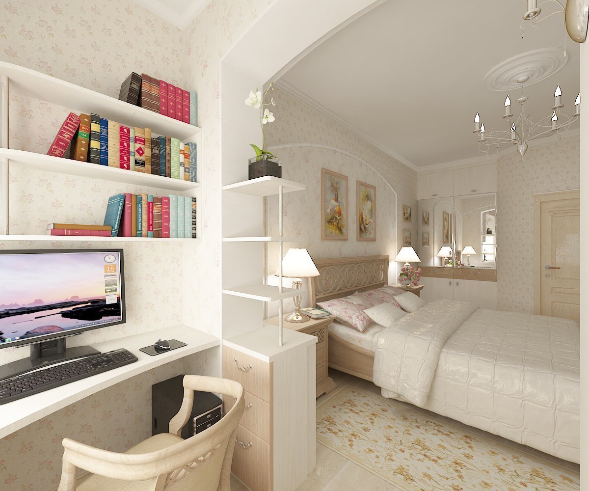 El dormitorio pequeño y el estudio serán apropiados. La versión ultra compacta es adecuada para estas habitaciones: un lugar de trabajo en un armario. En el borde inferior de la decoración de las paredes, a menudo se permite que líneas horizontales u ornamentos expandan el espacio. En tal habitación se usa una abundancia de tonos claros y pastel. Las ventanas no tienen cortinas pesadas, suficientes cortinas de luz o paneles de bambú que maximicen la apertura durante el día. En habitaciones pequeñas, el uso de particiones completas es inaceptable. Solo las estructuras móviles o las estanterías ligeras con libros pintados de blanco y sus sombras pueden actuar en su papel. Una de las opciones populares son las paredes falsas de vidrio esmerilado. Se pueden grabar dibujos en ellos, si el estilo del interior lo permite. A menudo, la zonificación generalmente se abandona y el lugar de trabajo se coloca a un lado de la cabecera de la cama o a los pies. Desafortunadamente, esta opción no es muy conveniente si una persona está durmiendo y la otra está trabajando. En habitaciones con una escasez aguda de espacio (por ejemplo, 4 m2) no tiene que elegir.Si la habitación tiene una forma no estándar y hay un nicho en ella, entonces se coloca el área de trabajo.