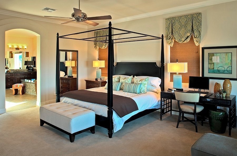 En el minimalismo, las pantallas portátiles orientales se ven espectaculares como un delimitador de zonas combinadas. El estilo nos llegó de Japón, por lo que los dibujos usan temas: una geisha con un paraguas, una rama de sakura, una pagoda, un loto, un abanico. La ventaja se dará a los colores blanco, gris y negro. Es permisible usar tonos muy claros de verde, rosa, lila, azul como una nota "en vivo". Si el propietario del área de trabajo prefiere el desorden creativo, entonces su inventario tendrá que almacenarse en estantes cerrados, y la estantería debe seleccionarse. Este estilo oriental no tolera detalles y caos innecesarios. Para combinar el dormitorio con el estudio en los clásicos, se utilizan arcos de lujo con estuco y monogramas. La sala prevalecerá en tonos tranquilos (beige, chocolate, tonos miel), textiles caros y pesados, una abundancia de oro, cristal, bronce y patrones ligeros. Una secretaria y una cama con dosel son una gran adición a la pintura elegante y cara en general. Este estilo se basa en una simetría estricta. Una habitación clásica debe hablar discretamente sobre la prosperidad de los propietarios, por lo que en su diseño es natural y, por lo tanto, se utilizan materiales caros.