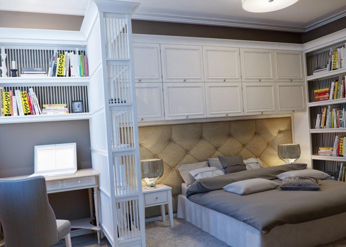 El área de trabajo siempre está asociada con muebles de oficina funcionales, que no tienen lugar en el dormitorio. En esta situación, tienes que encontrar un compromiso.En ambas zonas, el mobiliario debe ser lo más neutral y versátil posible, pero sin la sensación de una "casa del tesoro", que a menudo se encuentra en las oficinas. El conjunto mínimo incluye una cama para dormir, un armario, mesitas de noche o una cómoda, un lugar de trabajo, una silla, una estantería. Opciones de aspecto original con camas transformadoras. Por la noche, la litera se despliega, y durante el día se ensambla de forma compacta y se convierte en un acogedor sofá. Por lo tanto, será posible matar dos pájaros de un tiro: liberar espacio para el movimiento sin interferencias, organizar un rincón acogedor para descansar un día. En los apartamentos con ventanas panorámicas, la cama generalmente tiene cabecera a las ventanas. El diseño especial del modelo le permite plegarlo en un sofá de dos lados con un respaldo común. Tal solución no estándar permite organizar dos zonas independientes a la vez: para ver las bellezas circundantes y para beber té con los invitados. Una maravillosa oportunidad para encontrar su rincón tranquilo para quienes gustan de la privacidad. El gabinete y el estante se pueden combinar en un diseño complejo. Algunos modelos proporcionan tanto relleno interno como estantes en la parte posterior, que no se debe mover a la pared. Es importante saberlo. Para distinguir entre habitaciones, es mejor utilizar un estante con estantes. En habitaciones pequeñas, creará una sensación de ligereza de la barrera, que no cargará y abarrotará el espacio.