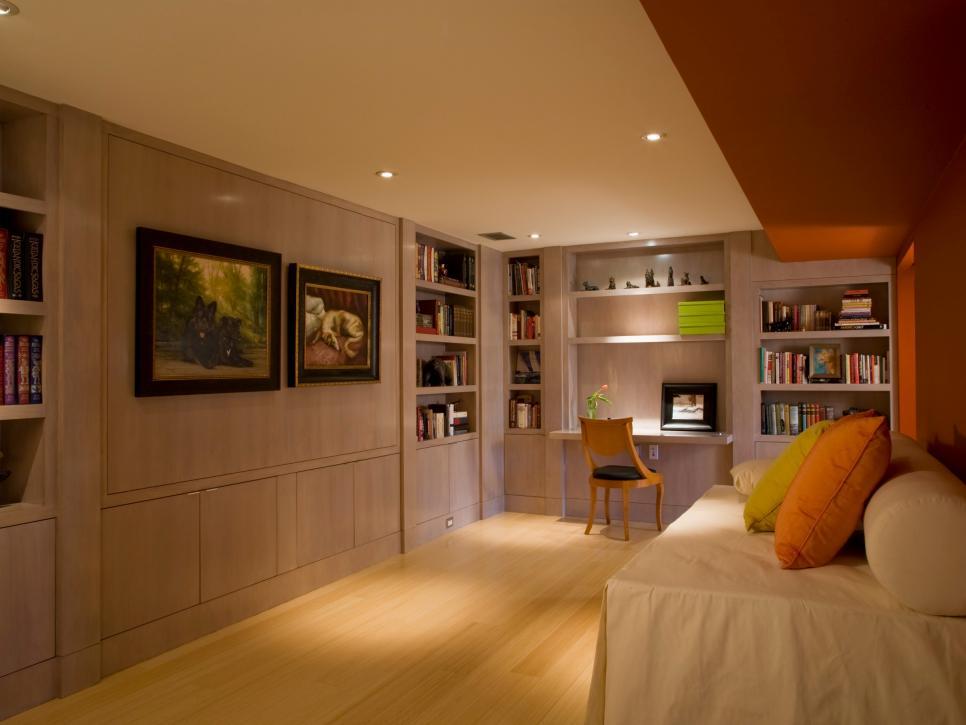 En el dormitorio, la oficina tendrá que combinar no solo dos áreas funcionales, sino casi todos los tipos de iluminación. Sin iluminación central, la habitación parecerá sombría. En el área de relajación, un par de apliques o lámparas en las mesitas de noche es suficiente. Acentuar el borde de las zonas. Por ejemplo, un arco decorativo o podio está marcado con focos. No estresan mucho la vista, pero agregan espacio y estilo a la habitación. La iluminación direccional se debe aplicar en el área de trabajo (lámpara de mesa) y posiblemente en el área de la cama, si a los propietarios les encanta leer antes de acostarse.