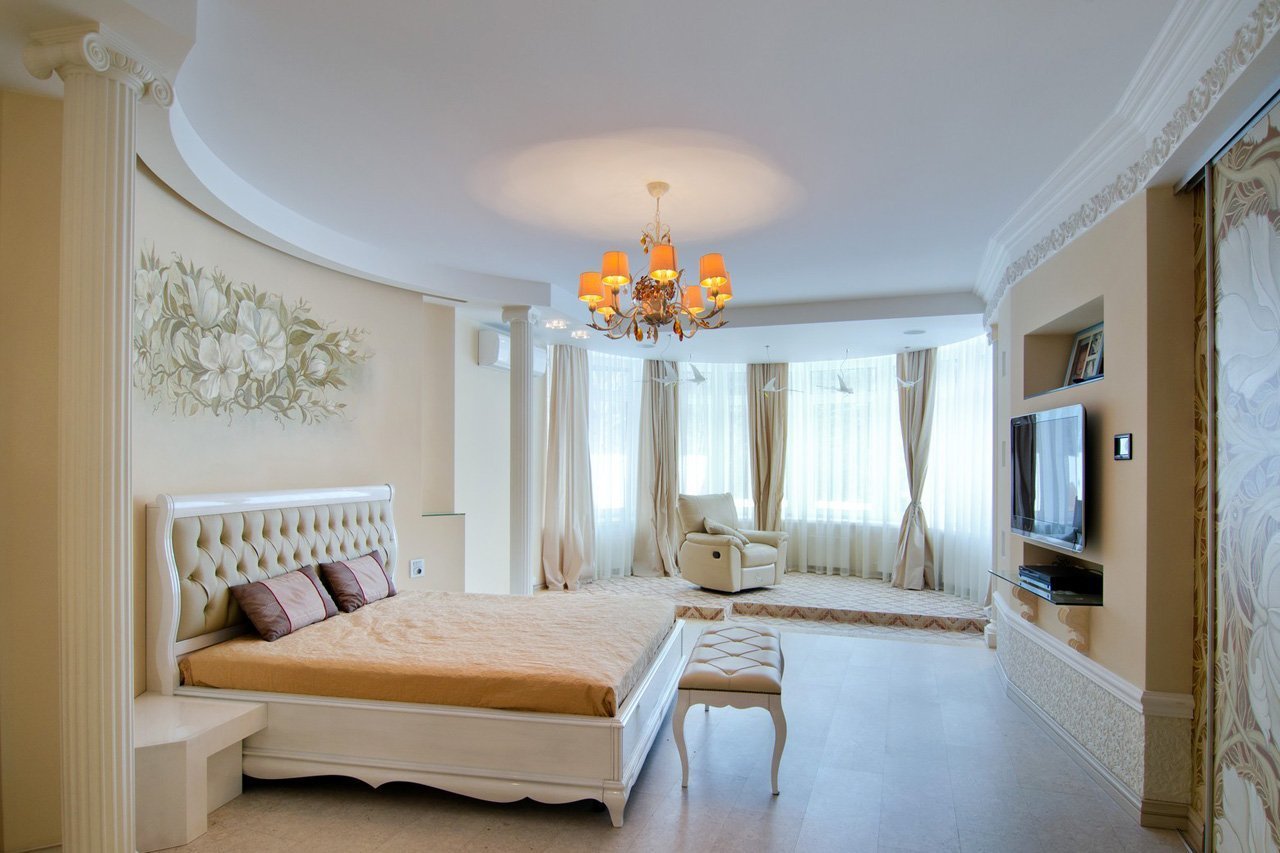 En versiones tradicionales, los techos están enlucidos o pintados. Anteriormente, los propietarios estaban atormentados al pegarlos con papel tapiz, pero esta opción es cosa del pasado como poco práctica y requiere mucho tiempo. En casas particulares, la altura de los techos le permite instalar un complejo diseño de paneles de yeso que combina belleza y conveniencia. Puedes decorar la superficie con PVC. Las opciones del panel pueden verse ricas y elegantes si selecciona cuidadosamente el color y lo complementa con focos. Los techos tensados, aunque "vuelan al centavo", pero más que pagar sus gastos con su practicidad y durabilidad. El brillo brillante de la superficie se funde orgánicamente en casi cualquiera de los estilos modernos. Además, por encargo se decorará con adornos o patrones que se convertirán en lo más destacado de la habitación.