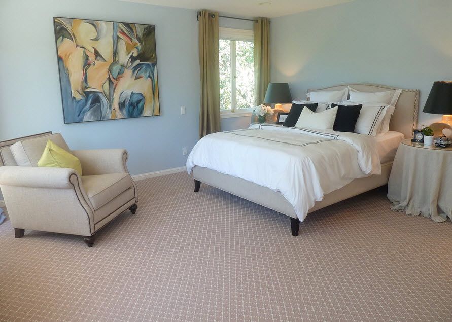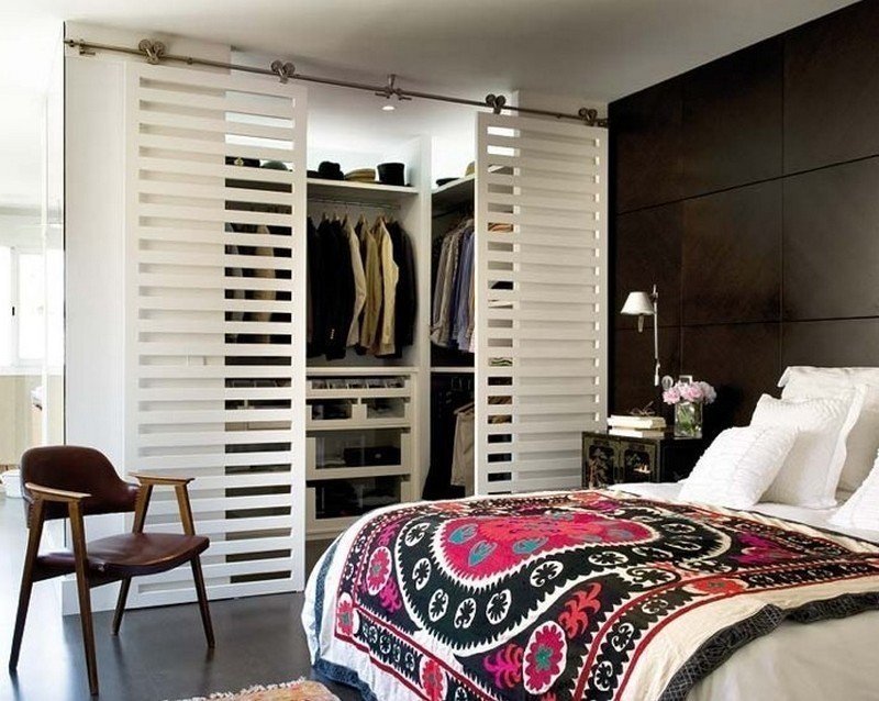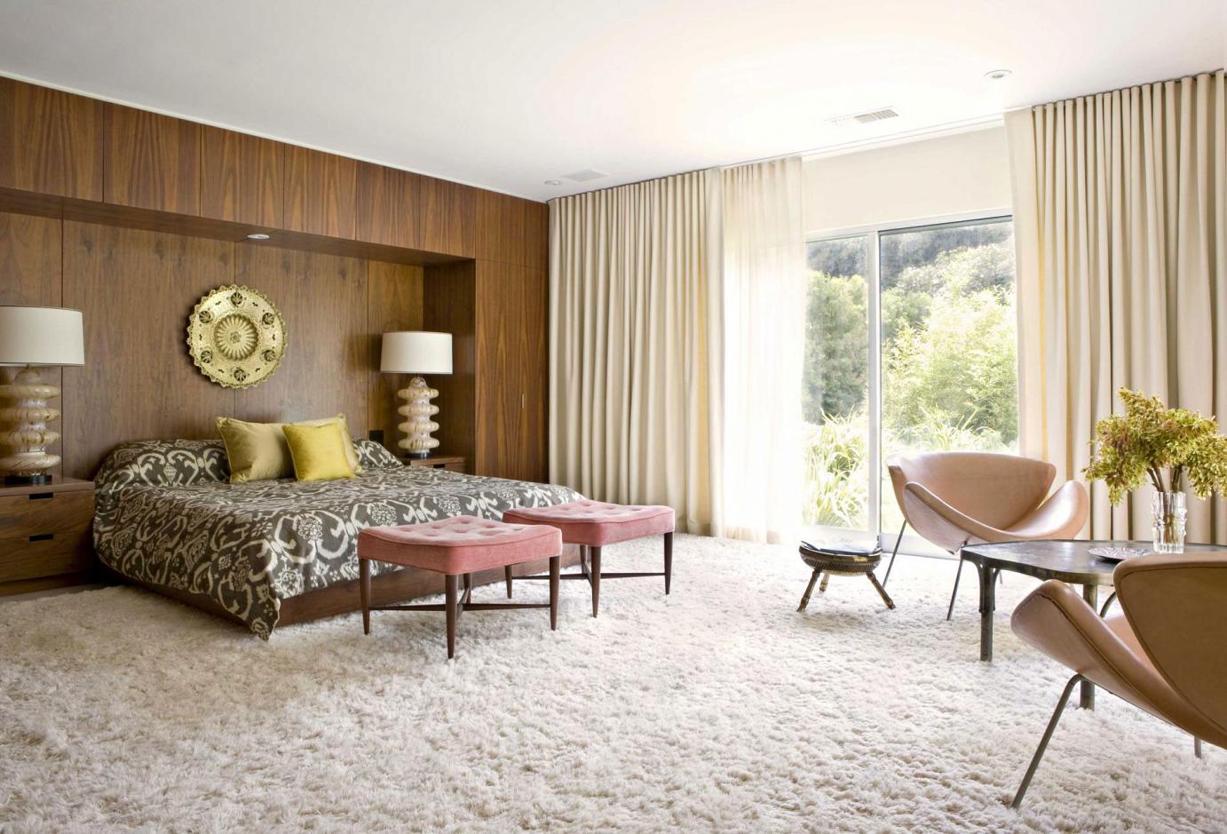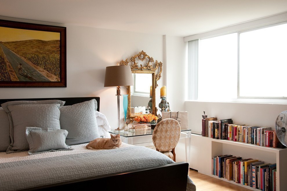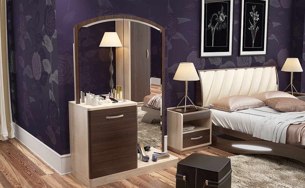 El mínimo de muebles estándar de un dormitorio incluye una litera y mesitas de noche. Dependiendo del tamaño de la habitación, este kit se complementa con una cómoda, un armario o un vestidor, un tocador para damas y un rincón de lectura con sillas y una mesa de café. Además, una de las paredes puede estar equipada con estantes abiertos o un estante para almacenar libros, recuerdos o elementos decorativos.