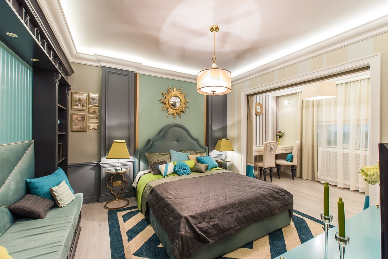 La iluminación de la habitación incluye central, local (de trabajo) y decorativa. La lámpara de techo se instala en habitaciones pequeñas, en habitaciones grandes es mejor reemplazarla con varias lámparas en cada una de las áreas funcionales. La iluminación decorativa está representada por focos alrededor del perímetro de la habitación. La luz suave y difusa agregará elegancia a la habitación. Esta opción se ve especialmente hermosa en los áticos, donde los techos tienen una forma original. La iluminación local está representada por un aplique o piso, lámparas de mesa sobre la cama, cerca de espejos o en el área de la esquina de lectura.