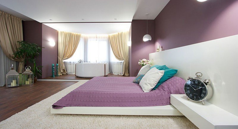 La comodidad psicológica de una persona en una habitación depende del esquema de color.Por supuesto, puede agregar un par de trazos realizados en los tonos favoritos de los propietarios a la paleta de colores. Sin embargo, para el área de dormir, hay ciertas reglas con respecto a los tonos. Como base, fondo, es mejor elegir colores suaves y pastel: blanco, beige, gris, oliva, lila, rosa, azul, amarillo pálido. Si hay falta de luz natural en la habitación, entonces con sombras frías es mejor no exagerar. Elija a favor de los tonos cálidos, y la habitación comenzará a "brillar" desde el interior. La gama de pasteles se diluye con tonos de acento: azul, negro, chocolate, verde, naranja. Con colores brillantes, también se debe tener cuidado en habitaciones estrechas, ya que pueden reducir considerablemente la habitación. En la espaciosa sala de estar-dormitorios, los profesionales recomiendan combinar dos paletas de colores diferentes para hacer que la zonificación sea más obvia.