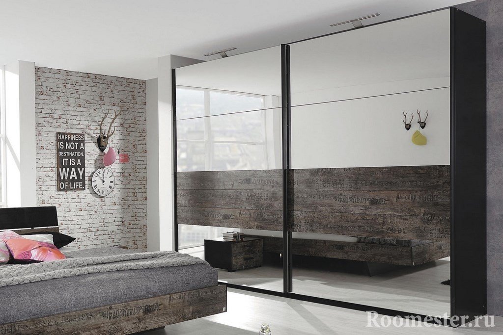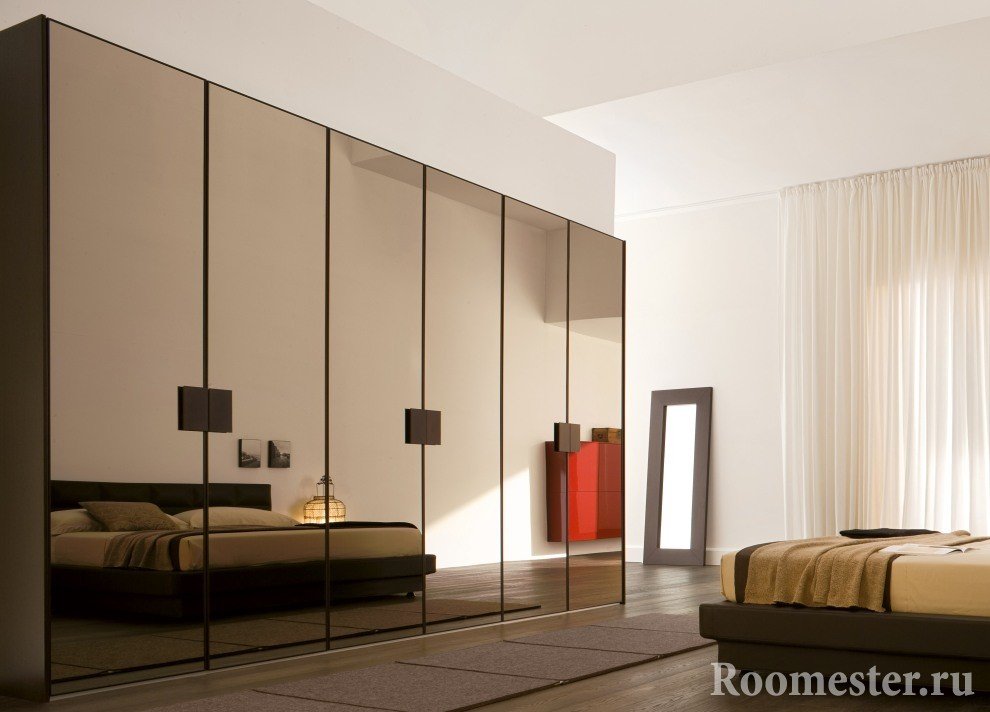 Al diseñar una habitación pequeña, la mejor opción para guardar ropa es un armario. Las puertas del gabinete deben estar sin ningún patrón y adorno. La mejor opción serían las puertas espejadas, que también ayudarán a aumentar visualmente el área de la habitación.