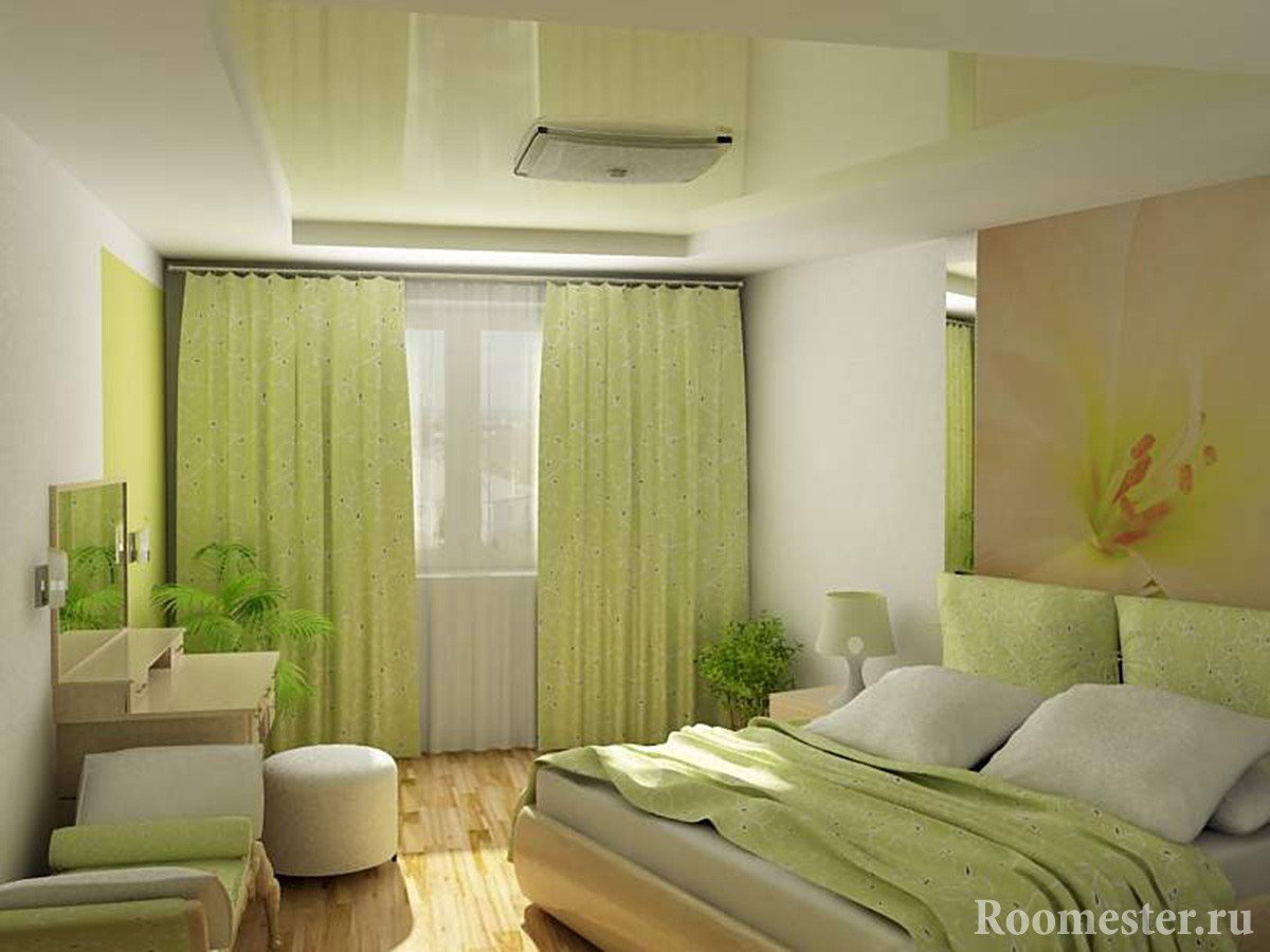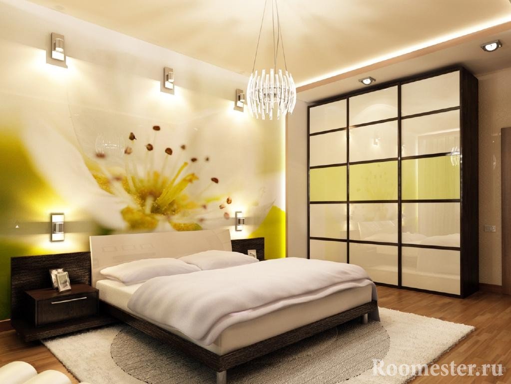 Para la iluminación adicional de la habitación, puede usar una lámpara de pie, así como pequeñas lámparas que están montadas cerca de la cama.