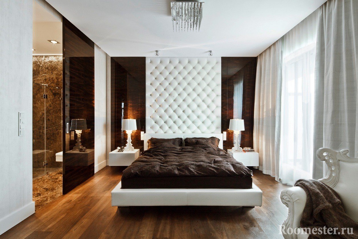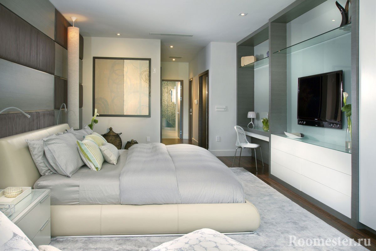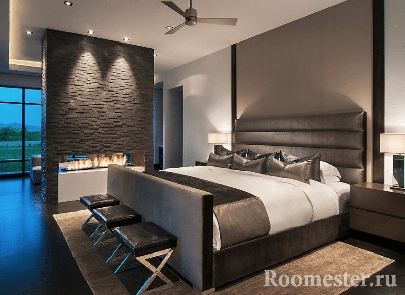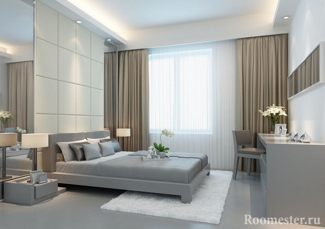 Los felices propietarios de las casas, donde se asigna un área grande para el dormitorio, pueden crear zonas adicionales dentro de la habitación, como lugares para dormir, relajarse, una oficina, un vestidor y otros. Para esto, se utilizan particiones, armarios deslizantes, espejos o colores de pared. Al mismo tiempo, todos los elementos interiores deben hacerse con el espíritu del minimalismo y combinar el esquema de color seleccionado.