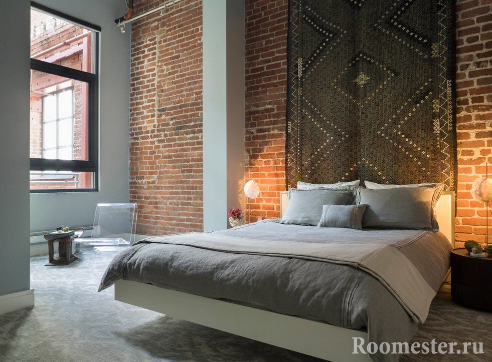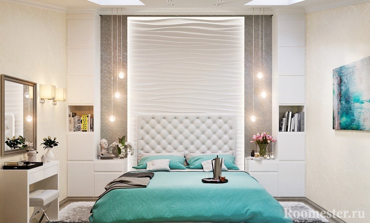 Al elegir una de las paredes del dormitorio como un elemento brillante del interior, se puede resaltar en un color diferente. También una solución interesante es la elección de una textura diferente de otras paredes. Por ejemplo, si las paredes de la habitación están cubiertas con papel tapiz blanco, entonces una de las paredes se puede colocar con ladrillo, que está cubierto con pintura blanca.