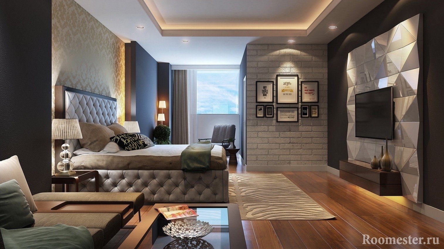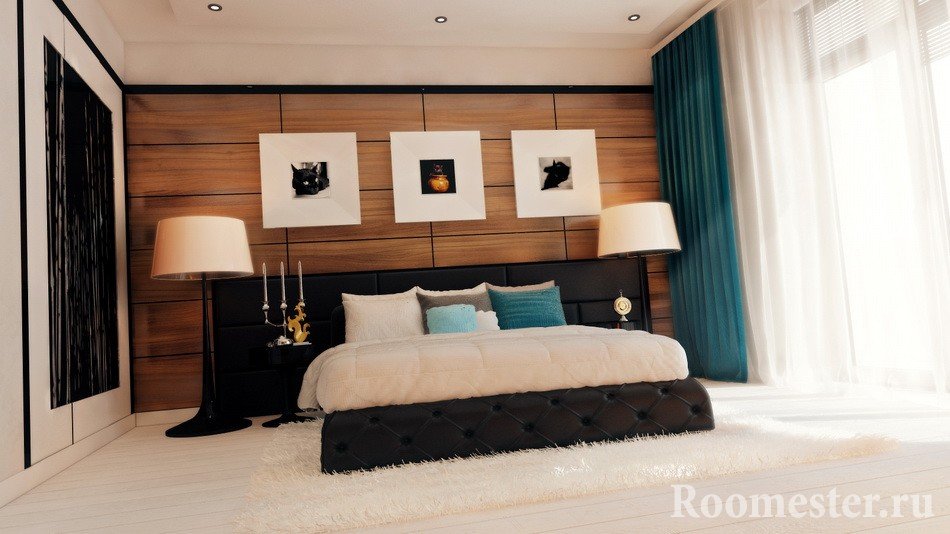 Para que el piso se combine armoniosamente con el interior del dormitorio en un estilo moderno, es mejor cubrir el piso con madera o piedra de imitación (mármol o granito). Si el propietario no puede permitirse el lujo de pisos hechos de materiales naturales, puede elegir un laminado o parquet con una imitación de dicho revestimiento. Usando pisos de madera en el diseño, es aconsejable repetir este material en los muebles.Una cama con lados de madera, estatuillas o una mesita de noche se verá bastante orgánica. Además, el interior se puede complementar con un acento brillante colocando una de las paredes con paneles de madera.