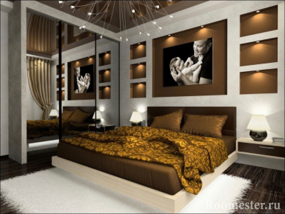 Para habitaciones más pequeñas, los armarios empotrados a ambos lados de la cama son una opción interesante. En este caso, la cama está en una depresión, por así decirlo, lo que ayudará a crear comodidad adicional en la habitación. Los armarios en la pared ayudarán a colocar mucha ropa y cosas. Las cajas de almacenamiento pueden colocarse debajo de la cama o montarse en la pared.