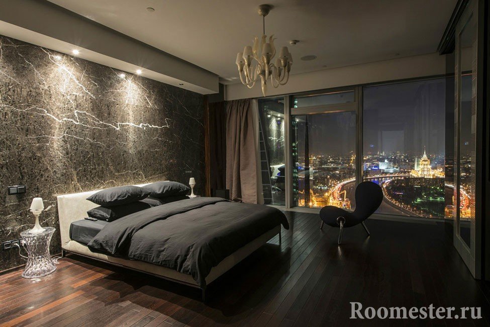 Se puede crear un minimalismo en la decoración del dormitorio sin usar papel tapiz y cubrir las paredes con cal o con la técnica del escarabajo de la corteza. Por lo tanto, el diseño de la habitación obtendrá un estilo más brutal.