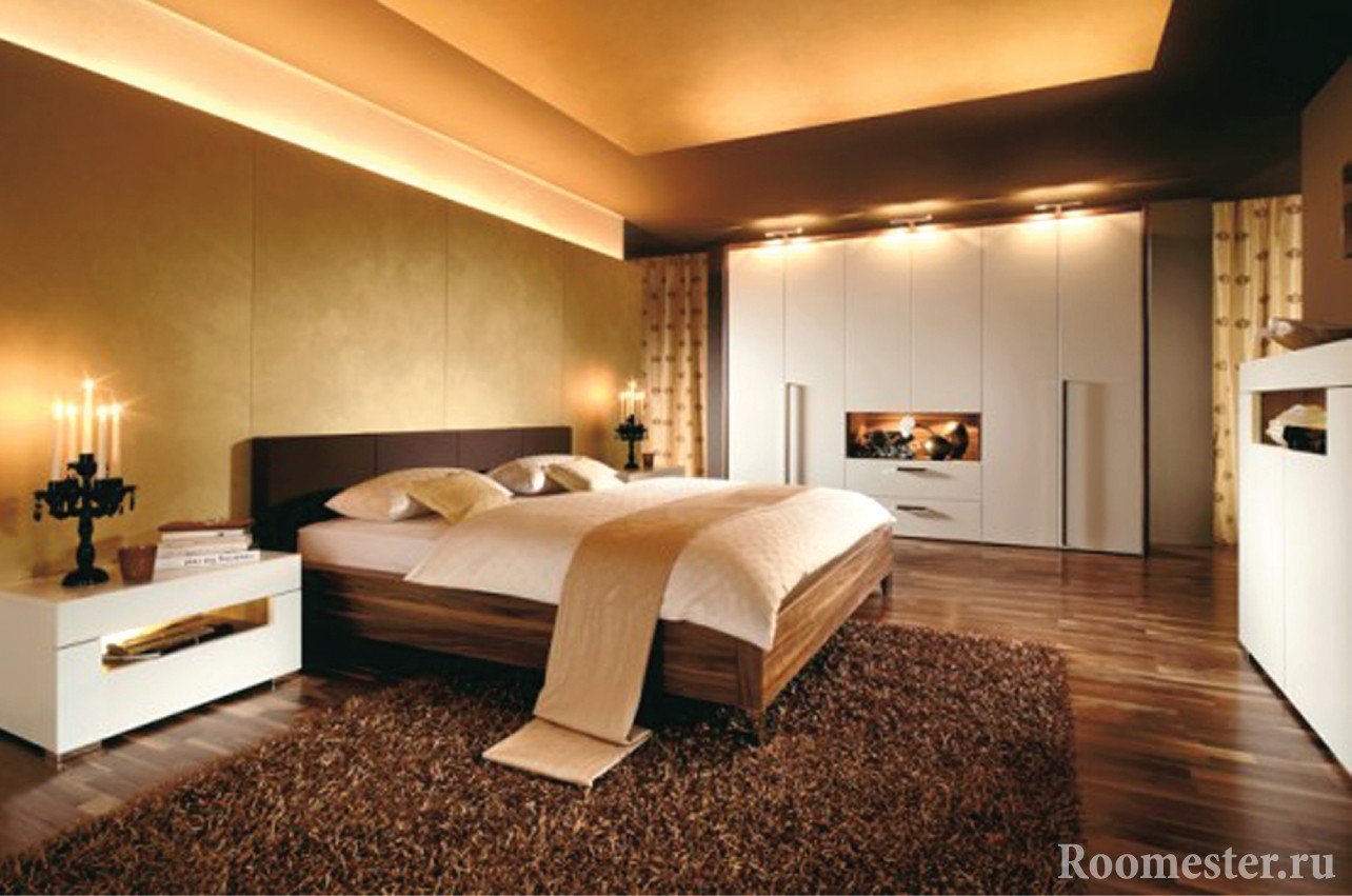 Una excelente solución en el interior será la iluminación del techo alrededor del perímetro. Esta solución se ve especialmente impresionante en techos de varios niveles. Para crear una comodidad especial en la habitación, puede colocar varias luces en el techo que iluminan solo ciertas partes de la habitación, por ejemplo, un armario, un espejo y puertas de entrada.
