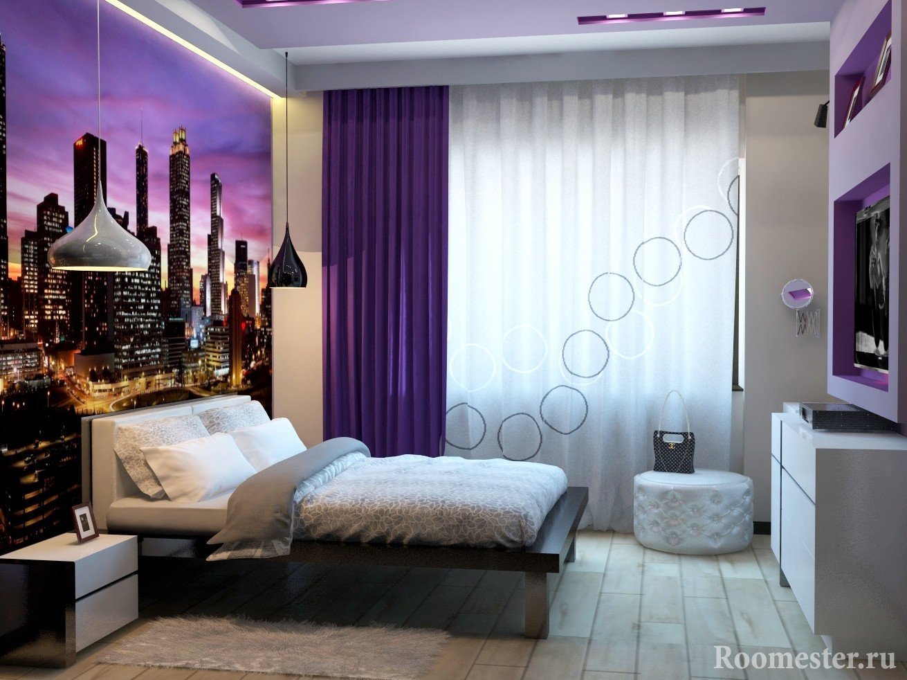 El diseño moderno de la habitación es difícil de imaginar sin los accesorios adecuados. Un acento interesante en la habitación será una tela escocesa brillante, que contrastará con el tono general de la habitación. El color brillante de la colcha se acentúa con almohadas de colores pastel en la cama. En el diseño, puede usar pinturas brillantes de arte moderno, que están saturadas de formas geométricas.