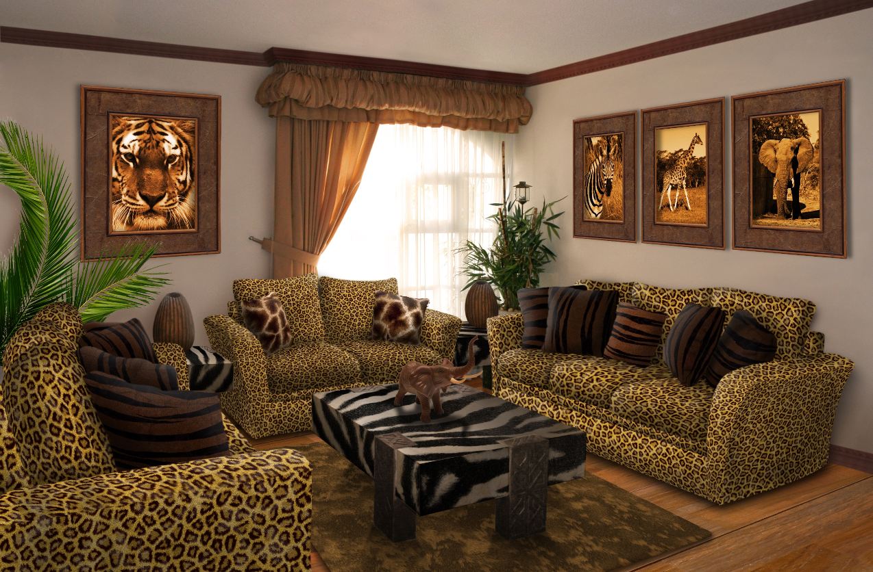 Para los juegos de muebles, se eligen exclusivamente elementos de madera con superficies procesadas aproximadamente. Debe dar la impresión de que cada objeto está hecho a mano. Se recomienda usar taburetes típicos para interiores africanos, cofres para guardar cosas, mesas bajas. En la paleta de colores, se prefieren tonos oscuros de marrón. La tapicería de los muebles tapizados está decorada con estampados "animales" que imitan las pieles de los animales africanos. Si elige superficies de cuero, entonces con una textura compleja para un cocodrilo, serpiente o hipopótamo.