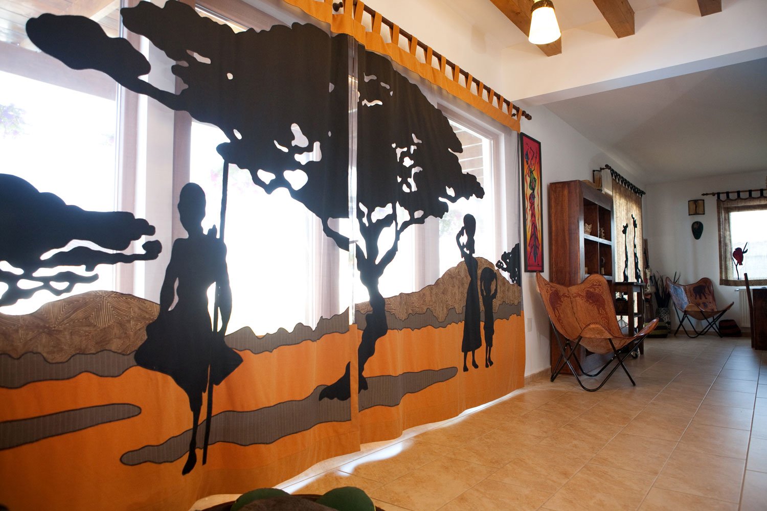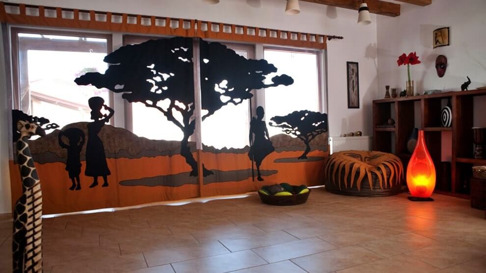 Los textiles en las primitivas chozas africanas se consideran la decoración principal. El piso debe estar cubierto con largas pistas con líneas transversales que se tejen de forma independiente. Como regla general, se utilizan hilos de varios tonos brillantes.En habitaciones grandes, el piso puede cubrirse con alfombras de pelo corto o productos que imiten la textura de "paja". Las cortinas se usan de telas gruesas y lisas. A veces recurrir a convenientes cortinas de bambú enrolladas. Aunque el material no es peculiar de África, las ventanas y puertas de muchas chozas locales están cerradas con lienzos similares.