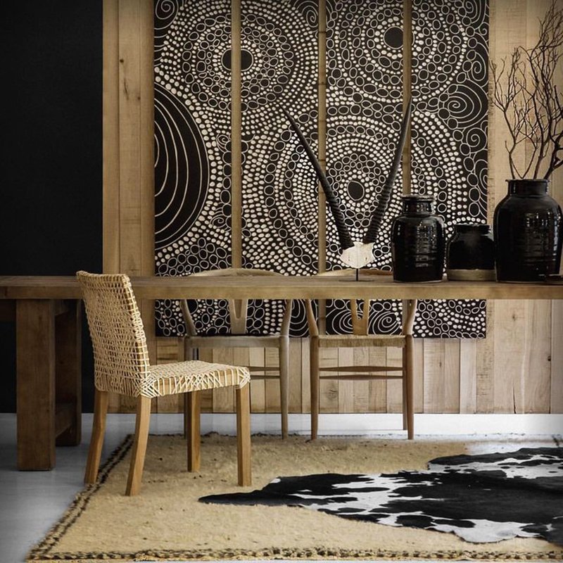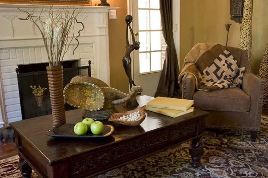 En el estilo africano, se utiliza una gran cantidad de adornos temáticos. Se utilizan en textiles, decoración y decoración. Además, la tendencia se caracteriza por una abundancia de simbolismo, ya que la religión y los cultos tradicionales ocupan un lugar especial en la cultura.