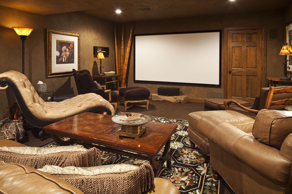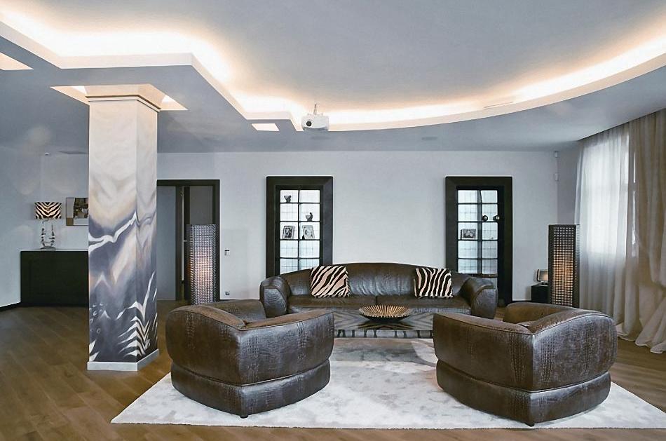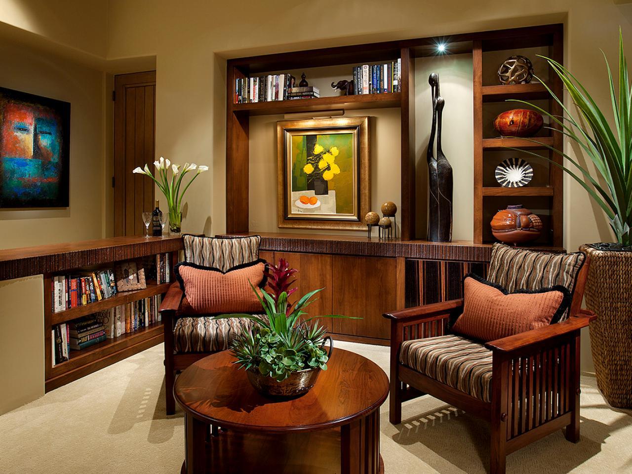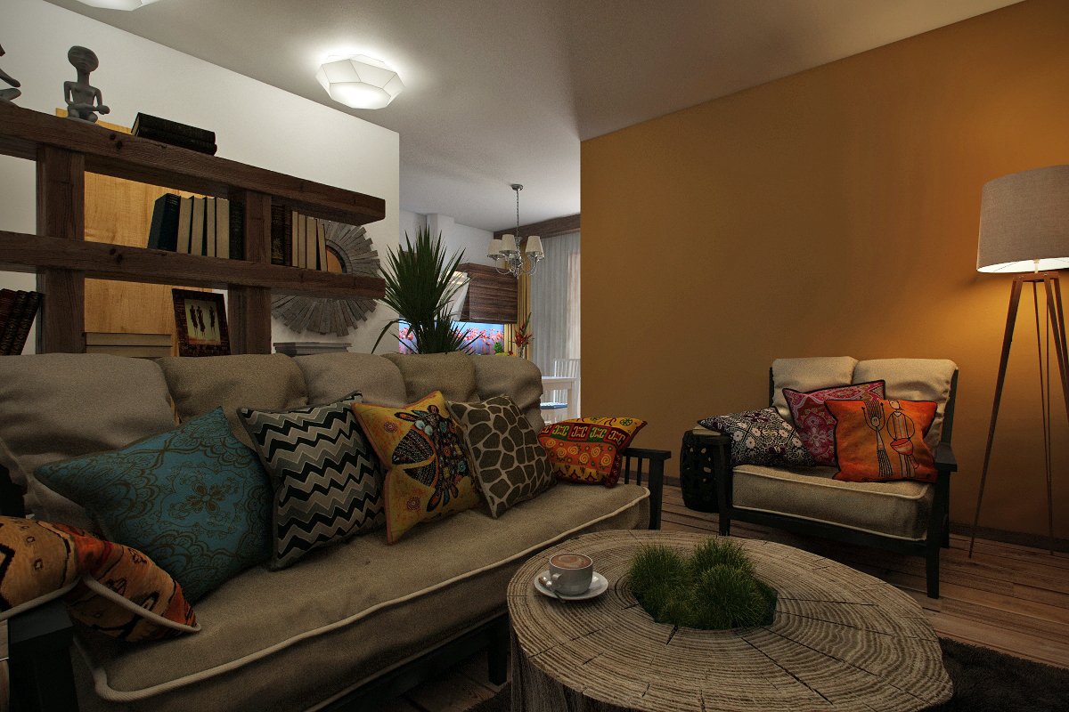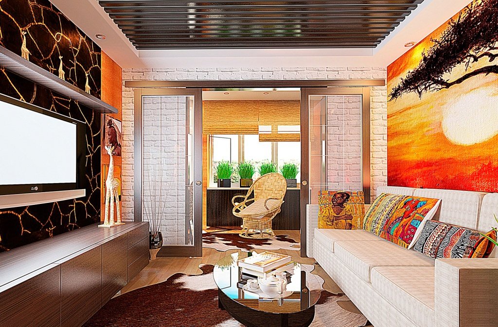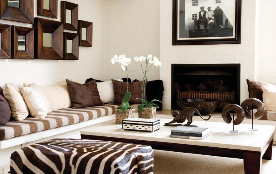 La sala de estar en el estilo africano tiene un toque especial y confort "cálido". Se recomienda utilizar esta dirección en el diseño de habitaciones espaciosas, donde se justificará el uso de sombras oscuras. La tapicería tapizada decora un juego de muebles tapizados. Un sofá y un par de sillones (o taburetes) se colocan cerca de una mesa de centro redonda de madera. La pared decorativa con TV está decorada con elegantes paneles, murales o pieles de animales. Alrededor cuelgan máscaras. Figuras de madera, jarrones con ramitas secas se colocan en superficies horizontales y se colocan duelas en el piso. La mesa de café está decorada con un reloj de arena, "colmillos" de elefantes o una composición de velas. El piso está cubierto de caminos, alfombras o pieles de cebras, leones, antílopes. El interior se complementa con un par de sillas de mimbre junto a la ventana al lado de la estantería para pasar unas vacaciones apartadas a un lado.