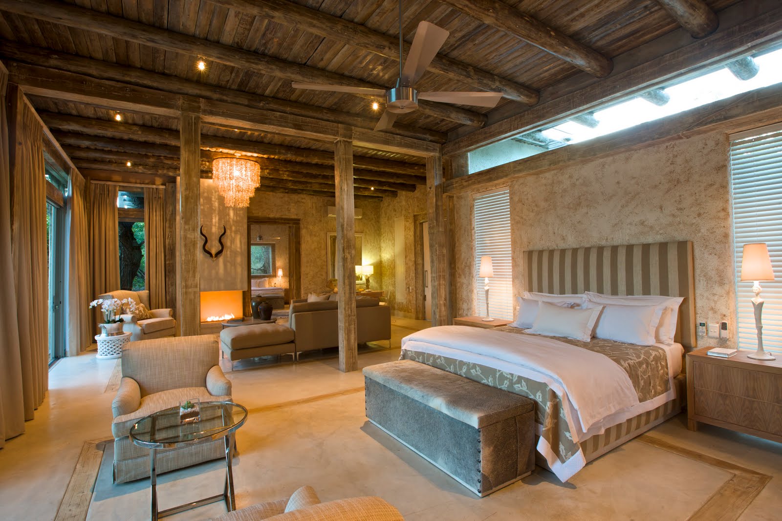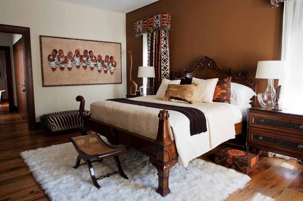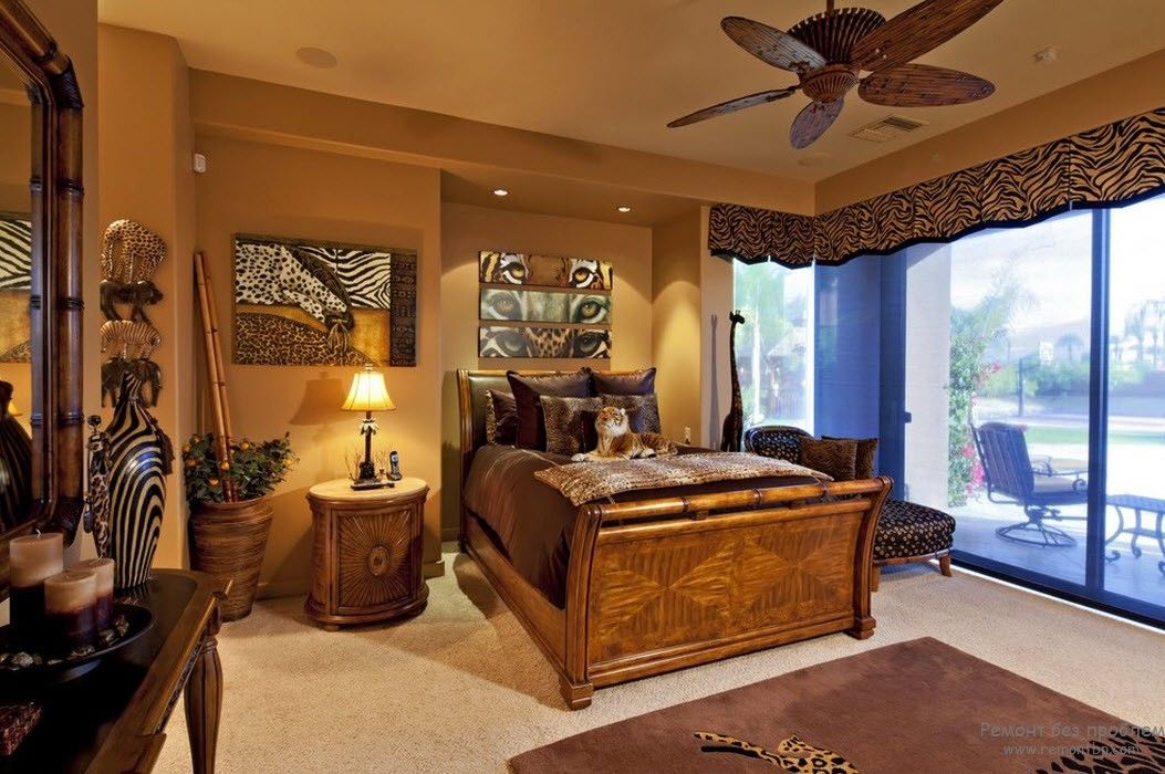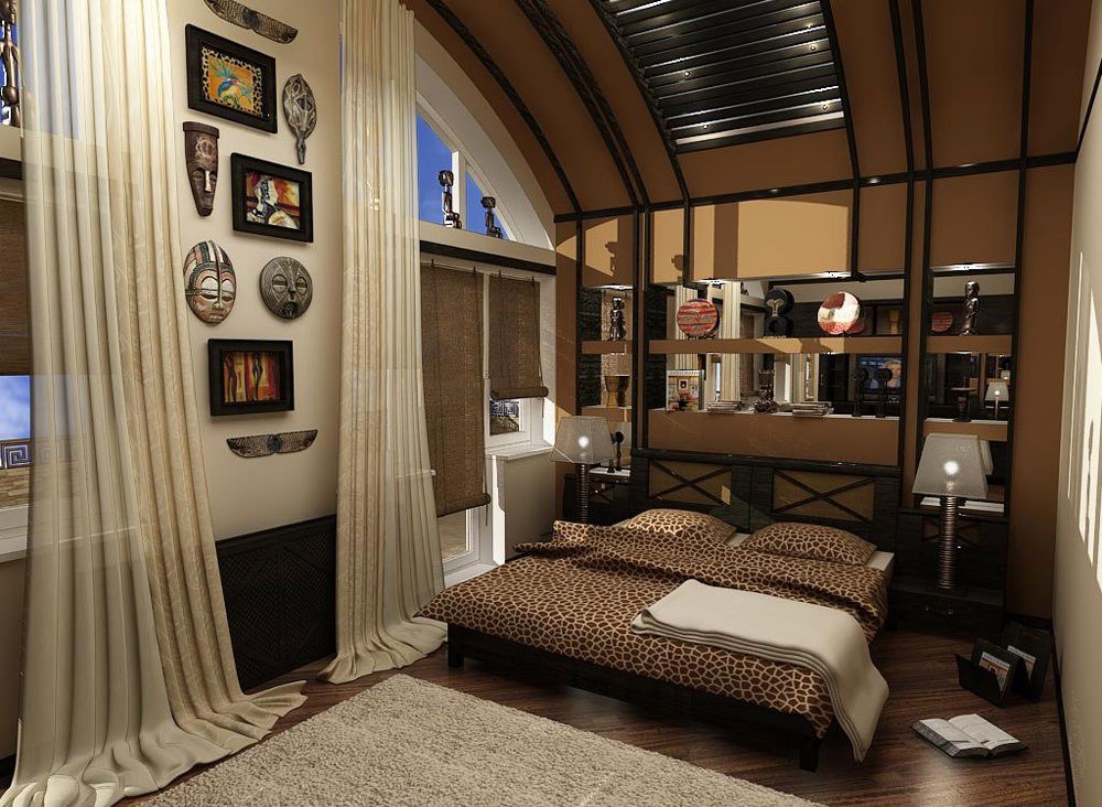 Como inspiración, use un paisaje típico africano al decorar la habitación: la puesta de sol que da color a las copas de los baobabs raros y las siluetas afiladas de las jirafas que marchan sobre sus negocios. Una imagen típica de la sabana puede ser una fuente de ideas creativas, y lo más importante, creará un interior lleno de paz y tranquilidad. En los colores, use tonos cálidos y suaves de amarillo y marrón. Por cierto, contribuirán a calmar y dormir bien.El techo está decorado con vigas de madera, y el resto de la superficie está acabada con yeso de "leche horneada". La cama de madera rugosa está cubierta con textiles simples y decorada con un par de almohadas de color oscuro. La pared decorativa en la cabeza está decorada con mimbre o arcilla. Apliques y mesitas de noche están instalados en ambos lados de la cama. El piso está cubierto con una alfombra suave con un pelo corto. Las paredes están decoradas con estuco o revestidas con paneles de madera clara. Una adición elegante al interior será una gran maceta con una planta. Las ventanas están cerradas con cortinas simples con un patrón étnico alrededor de los bordes.