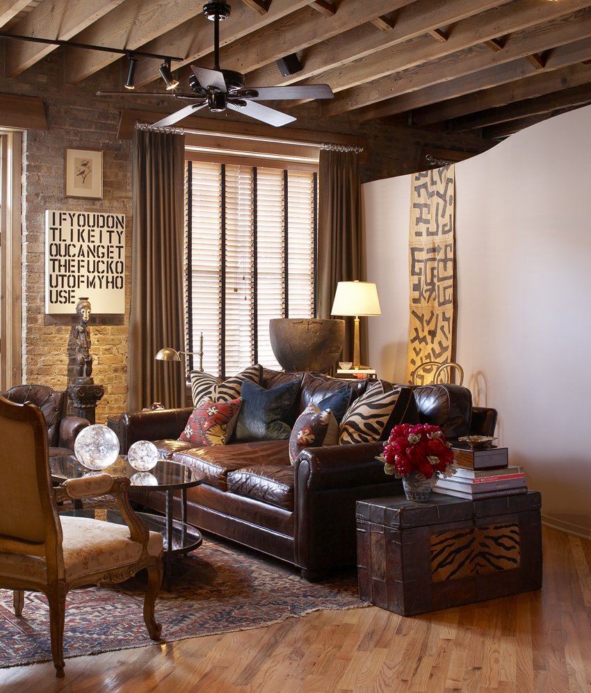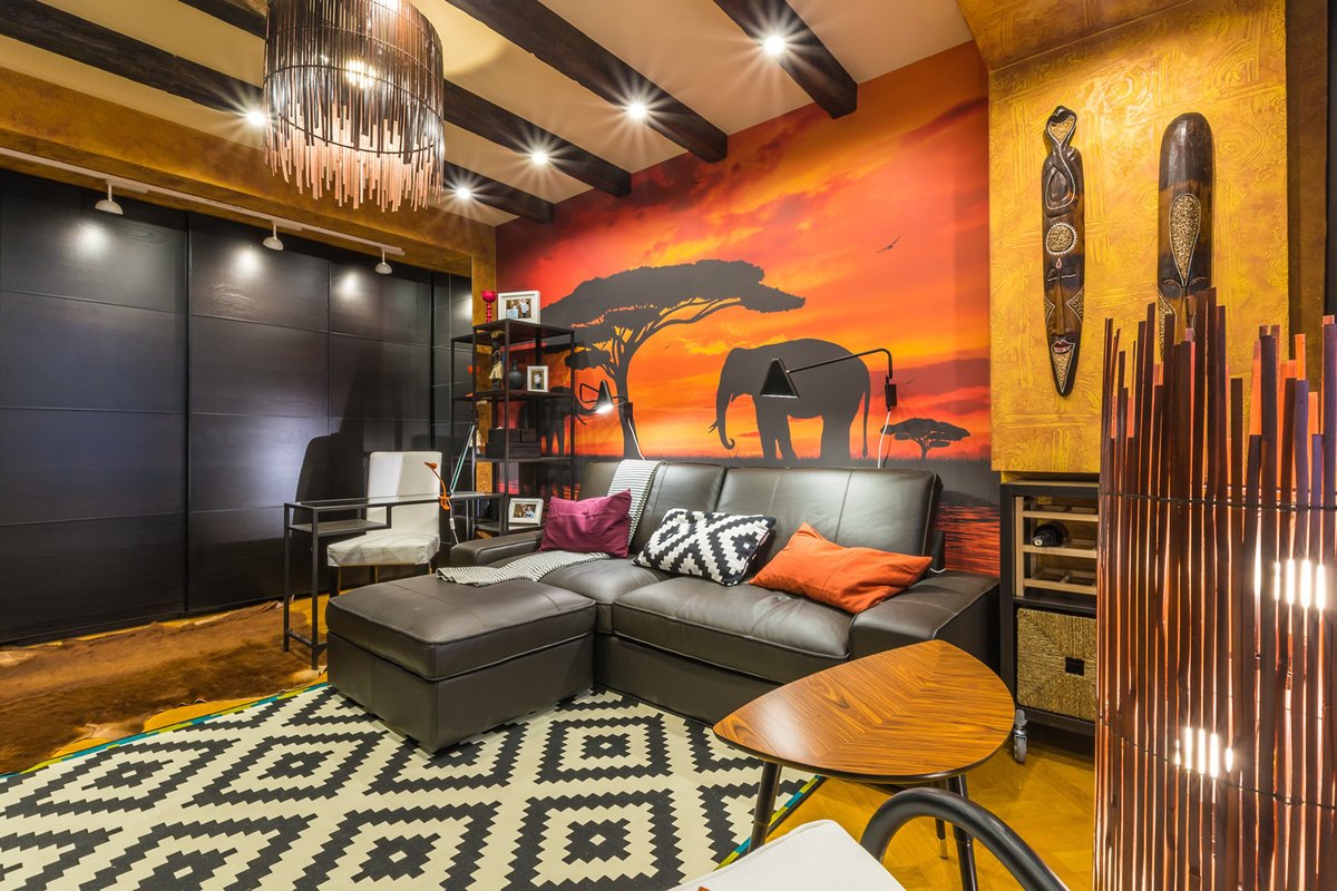 Las chozas africanas suelen ser una vista muy poco atractiva. Están construidos con materiales accesibles, que incluyen principalmente ramas, arcilla y paja. De hecho, para la vida que llevan las tribus locales, no se requiere más. Los apartamentos de lujo en los rincones "salvajes" de este continente se verían extremadamente inapropiados. Pero para los diseñadores, que tienen que hacer chozas de adobe a partir de cómodos apartamentos, la tarea es complicada, ya que a partir de materiales modernos necesitas crear algo similar a un acabado primitivo.