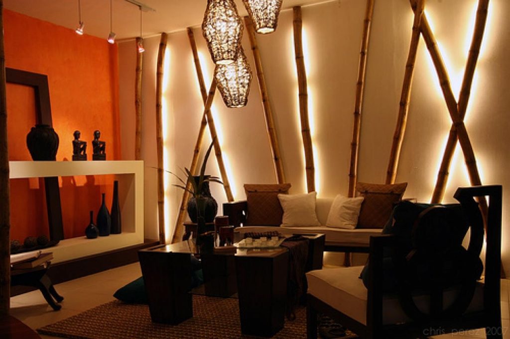 El estilo africano utiliza luz suave y difusa. Una opción ideal sería velas o bombillas, bien cerradas con tonos de vidrio amarillo o naranja. La lámpara de techo se elige lacónica de materiales simples con una configuración simple. Se presta especial atención a la iluminación adicional y decorativa. Las paredes están decoradas con apliques emparejados que enfatizan la textura y decoración de la superficie. Las lámparas alargadas se colocan en las mesas y en el piso.