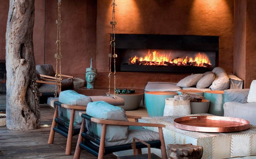 La combinación de colores del estilo africano consiste exclusivamente en tonos naturales. Los residentes locales nunca han tratado de traer nuevos colores a la paleta interior.Solo la ropa puede ser multicolor en África, la mayoría de los cuales son importados de países desarrollados. La combinación de colores de los interiores muestra los cuatro elementos: agua, tierra, aire y fuego. La base base se recoge de tonos marrones: terracota, ocre, chocolate, ladrillo, arena, nuez, sepia, café con leche, marrón. Se complementa con negro, rojo, a veces gris y superficies pintadas de azul o verde utilizando la técnica de "mezcla de colores", es decir, con manchas características. Los dos últimos colores se usan como acentos brillantes. Dado que el paisaje africano consiste predominantemente en tierra desnuda y agrietada con árboles que se extienden raramente, las coronas verdes o manantiales azules con agua son raros.
