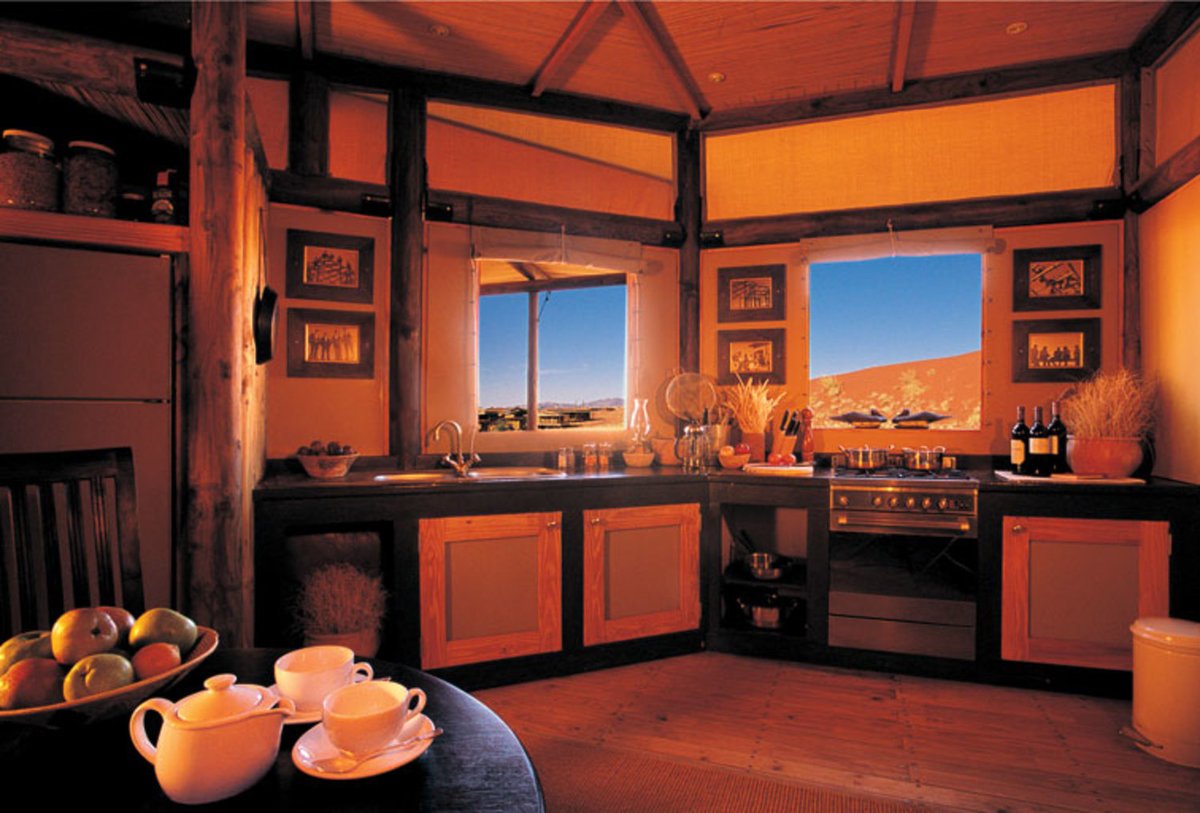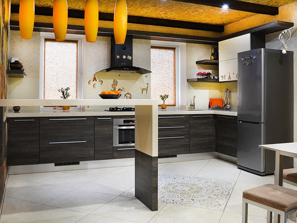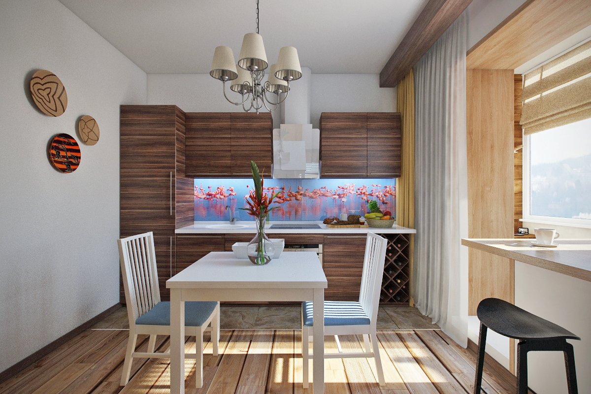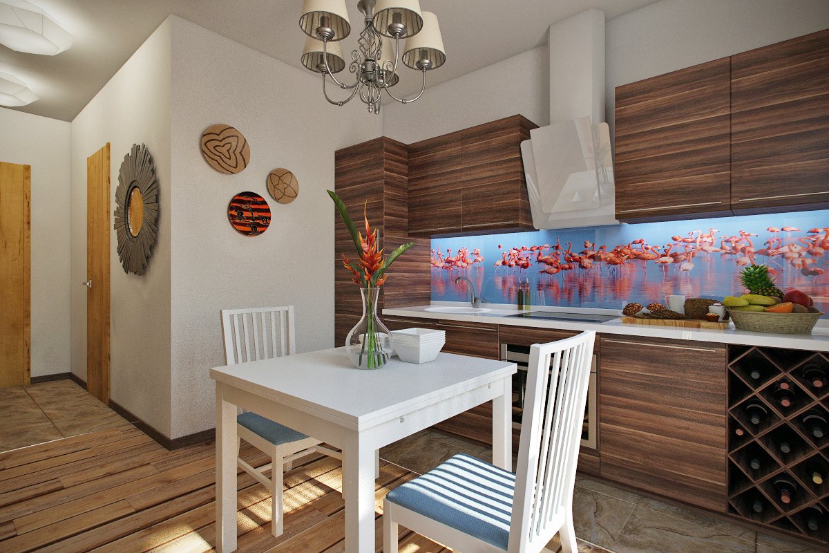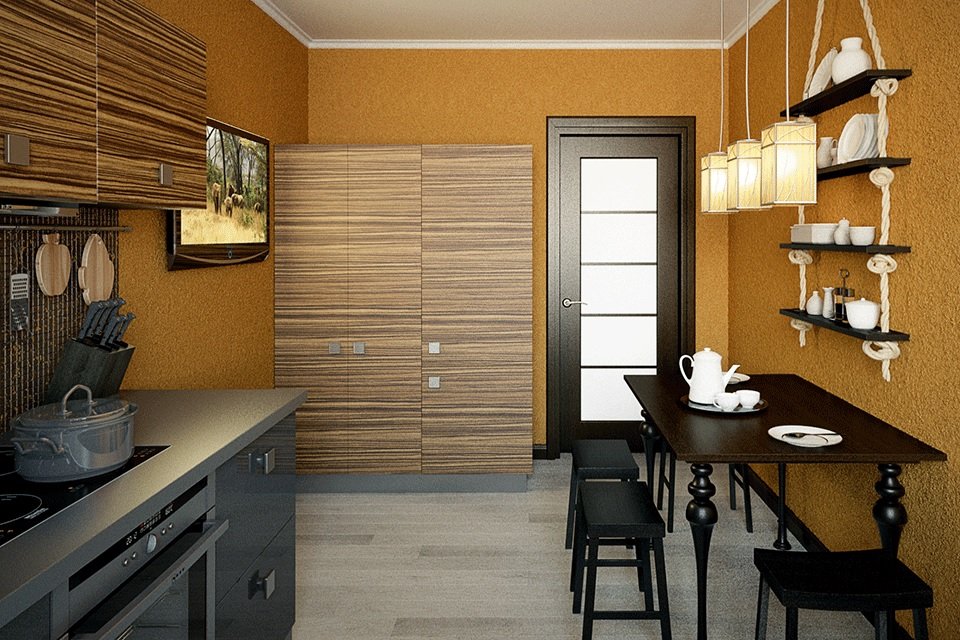 La cocina de estilo africano se presenta de acuerdo con los principios de concisión. En una realización tradicional, la comida se cocina en una estufa. Por supuesto, en apartamentos modernos tales unidades nunca se han visto. Sin embargo, debajo del hogar, puede estilizar la campana, terminando su superficie con un material que simule la arcilla. El piso está decorado con tonos oscuros. Un azulejo se verá elegante, cuya superficie imita arena o tierra agrietada. El delantal de la cocina está decorado con azulejos con motivos africanos temáticos o el paisaje romántico de la sabana. El grupo de almuerzo se separa de la zona de cocción mediante una división baja y ligera hecha de ramitas por el método de tejido. Un grupo de tres o cuatro lámparas en tapas de "paja" se cuelga sobre él. Las ventanas tienen cortinas de cortinas de lino claro. Las paredes están terminadas con papel de vinilo resistente a la humedad con una impresión de "bestia" en la superficie.