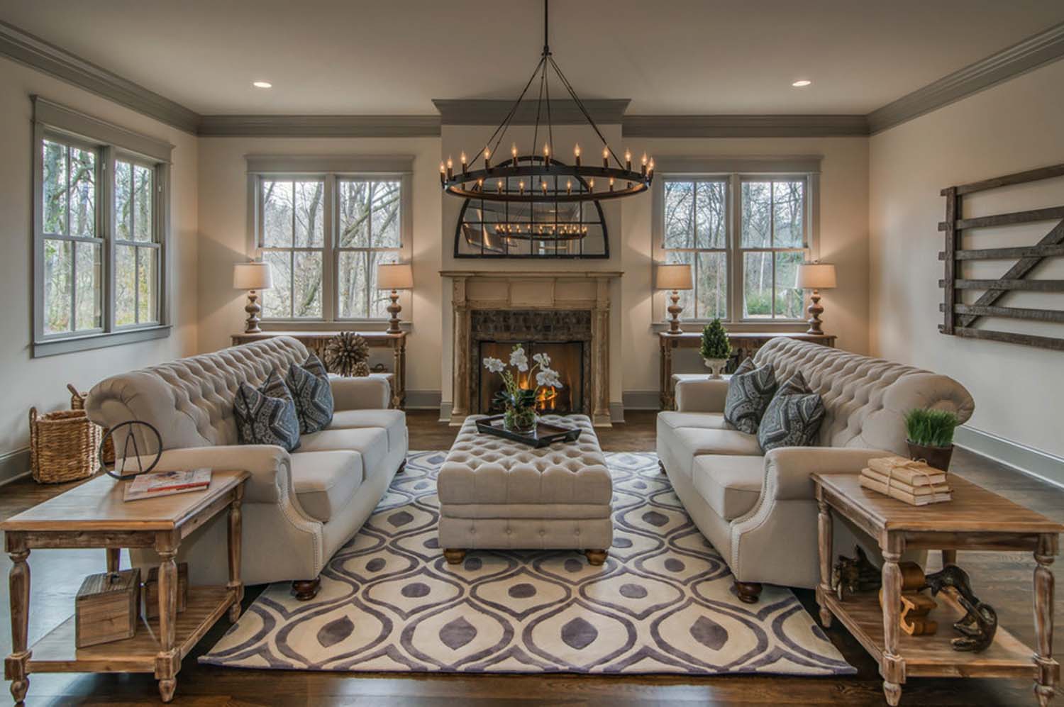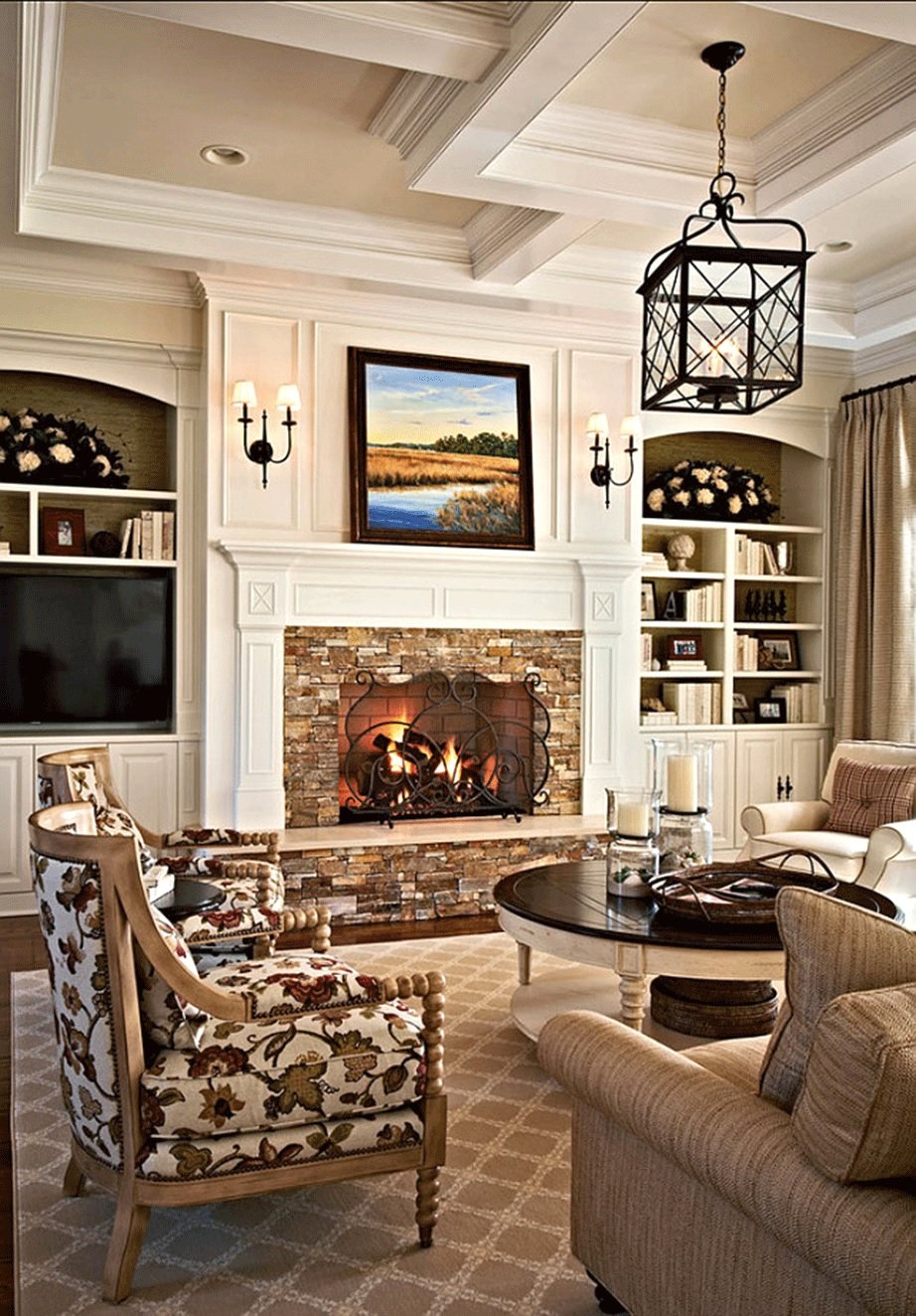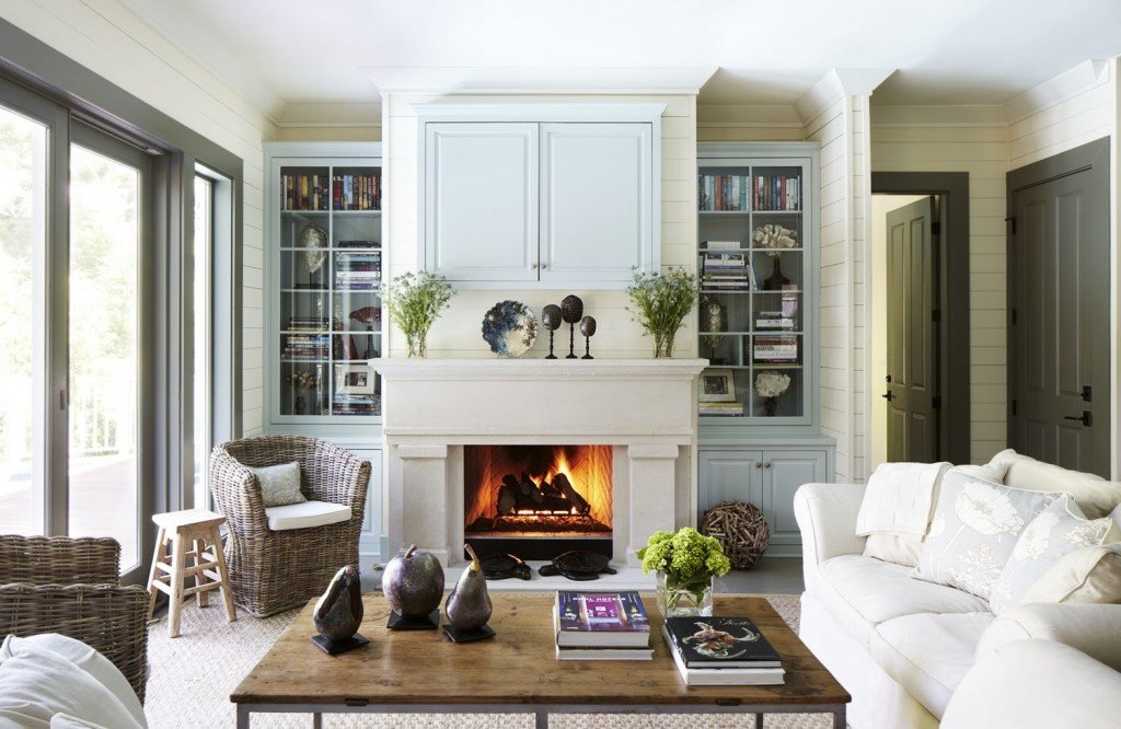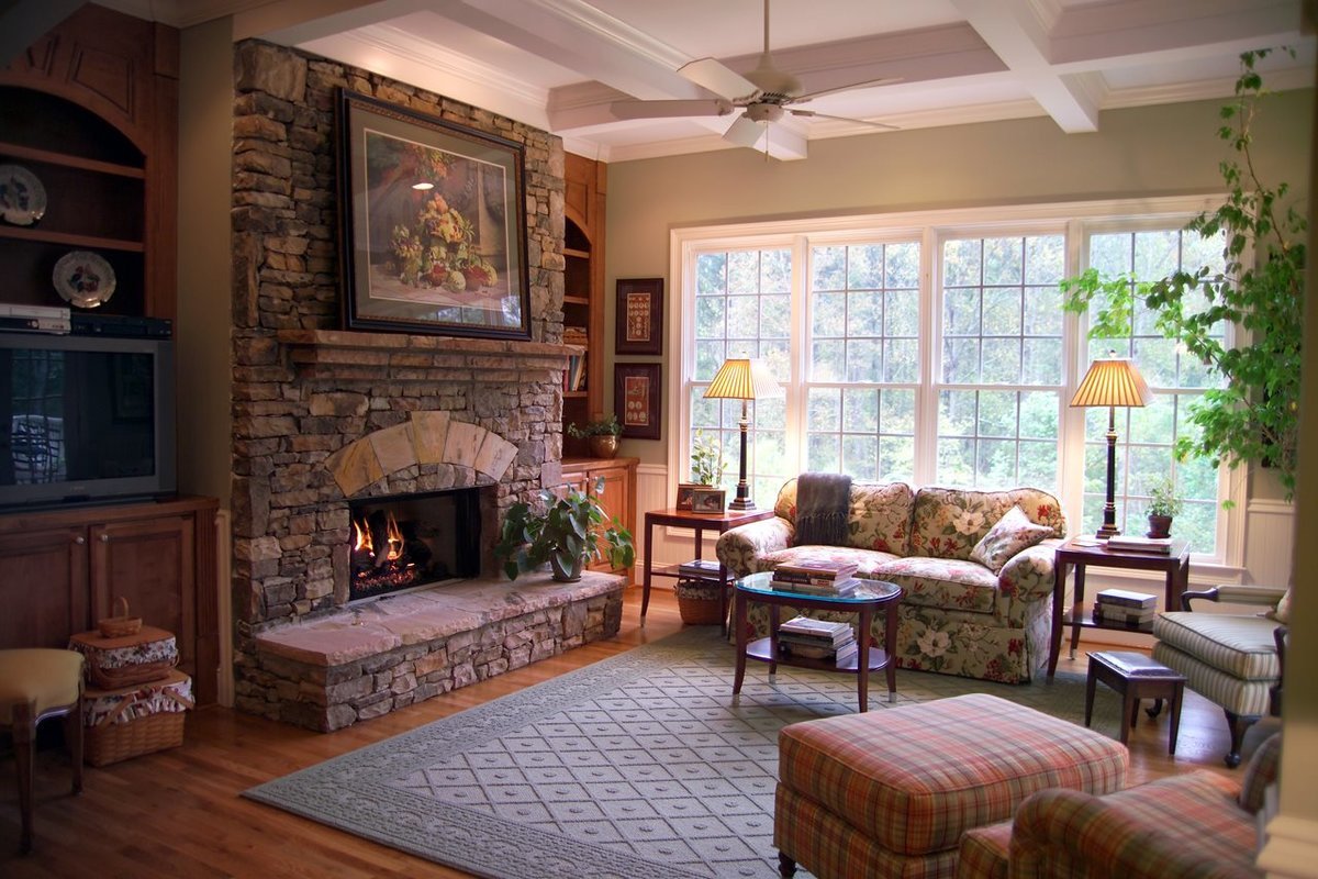 La dirección se originó en casas de campo ricas, y en absoluto en el interior, como muchos creen. La baratura y el ascetismo no son las características definitorias de este estilo. Paredes de madera, pisos, vigas a la vista en el techo, muebles toscos de madera en bruto son las características del país. Un atributo integral de la sala de estar es la chimenea frente al área de relajación con cómodos muebles tapizados, cuero tapizado o telas rugosas con una composición natural. El estilo es extremadamente cercano a la naturaleza, porque se basa en el uso de materiales ecológicos y colores naturales.