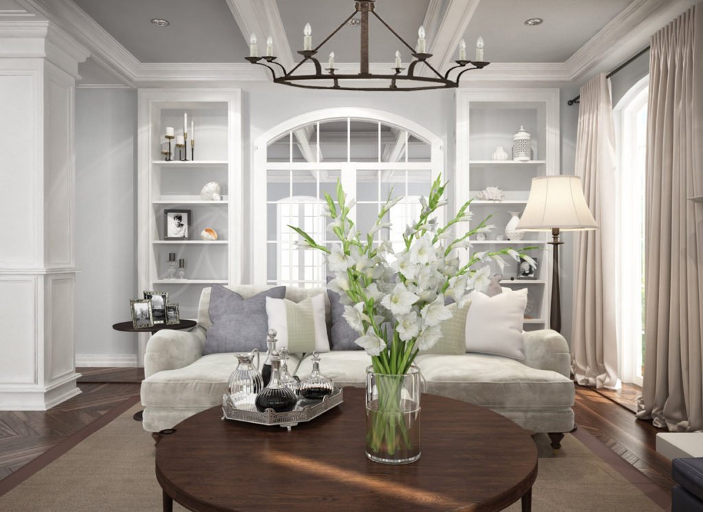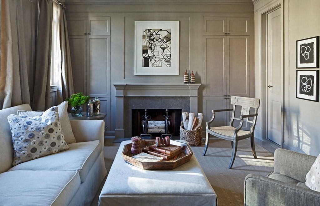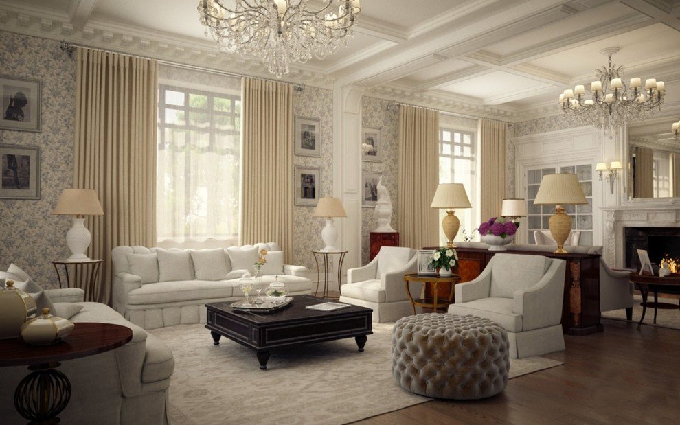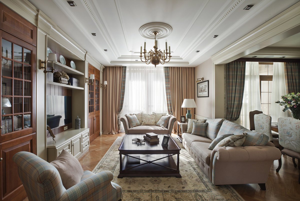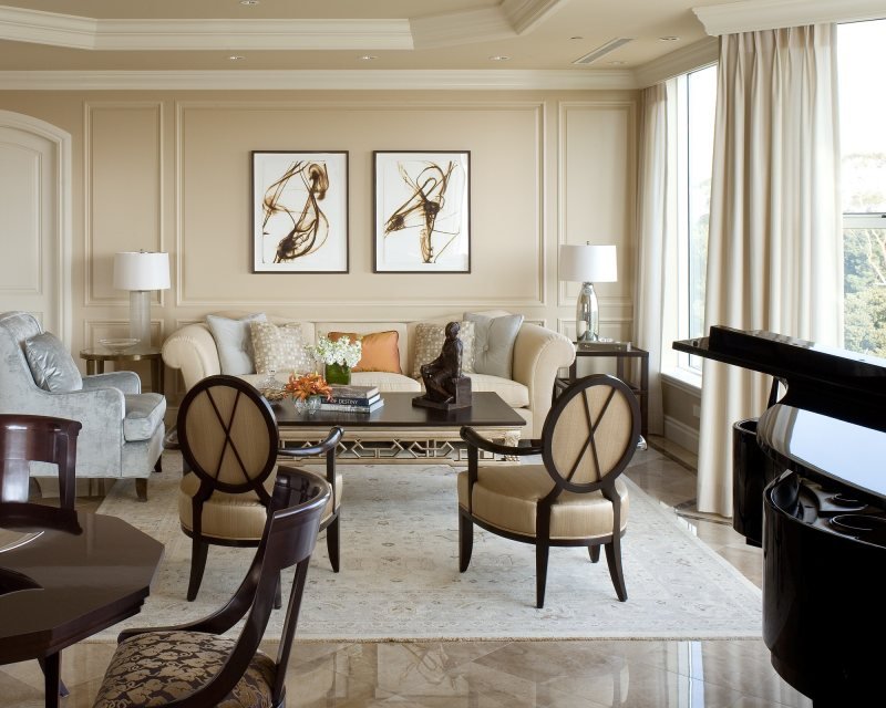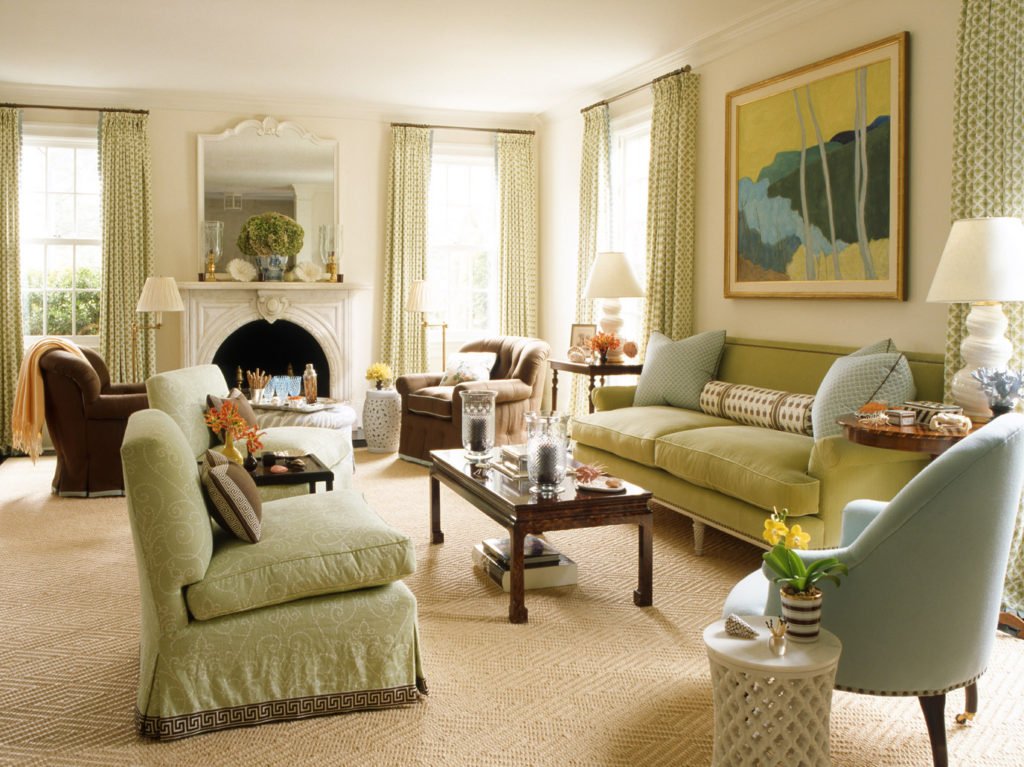 Es necesario equipar la sala de estar para que siga siendo cómoda, luminosa y espaciosa.El papel principal lo desempeñan los muebles tapizados masivos, que se ubican mejor en la parte central de la habitación cerca de la chimenea o un gran panel de televisión. Sillones y un sofá se concentran alrededor de una mesa de café en miniatura. Se mantiene una distancia bastante seria entre los objetos. En lugar de sillas suaves, se pueden usar análogos de mimbre desde los auriculares. Los dispositivos técnicos, una biblioteca, elementos decorativos se encuentran en nichos especialmente equipados. Las superficies horizontales generalmente están libres de decoración y artilugios. En el interior, el uso de grandes armarios o bastidores es inaceptable.