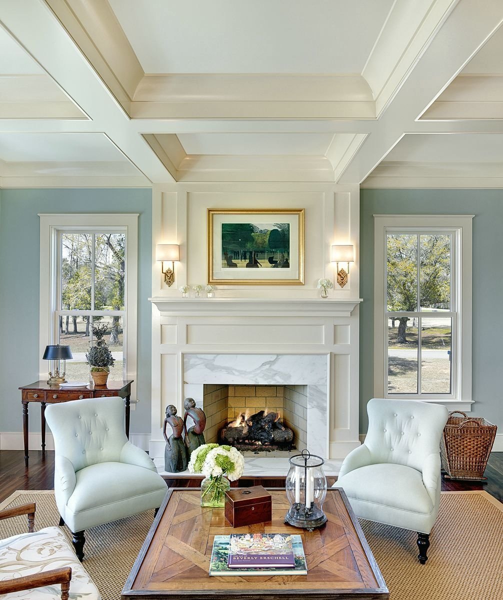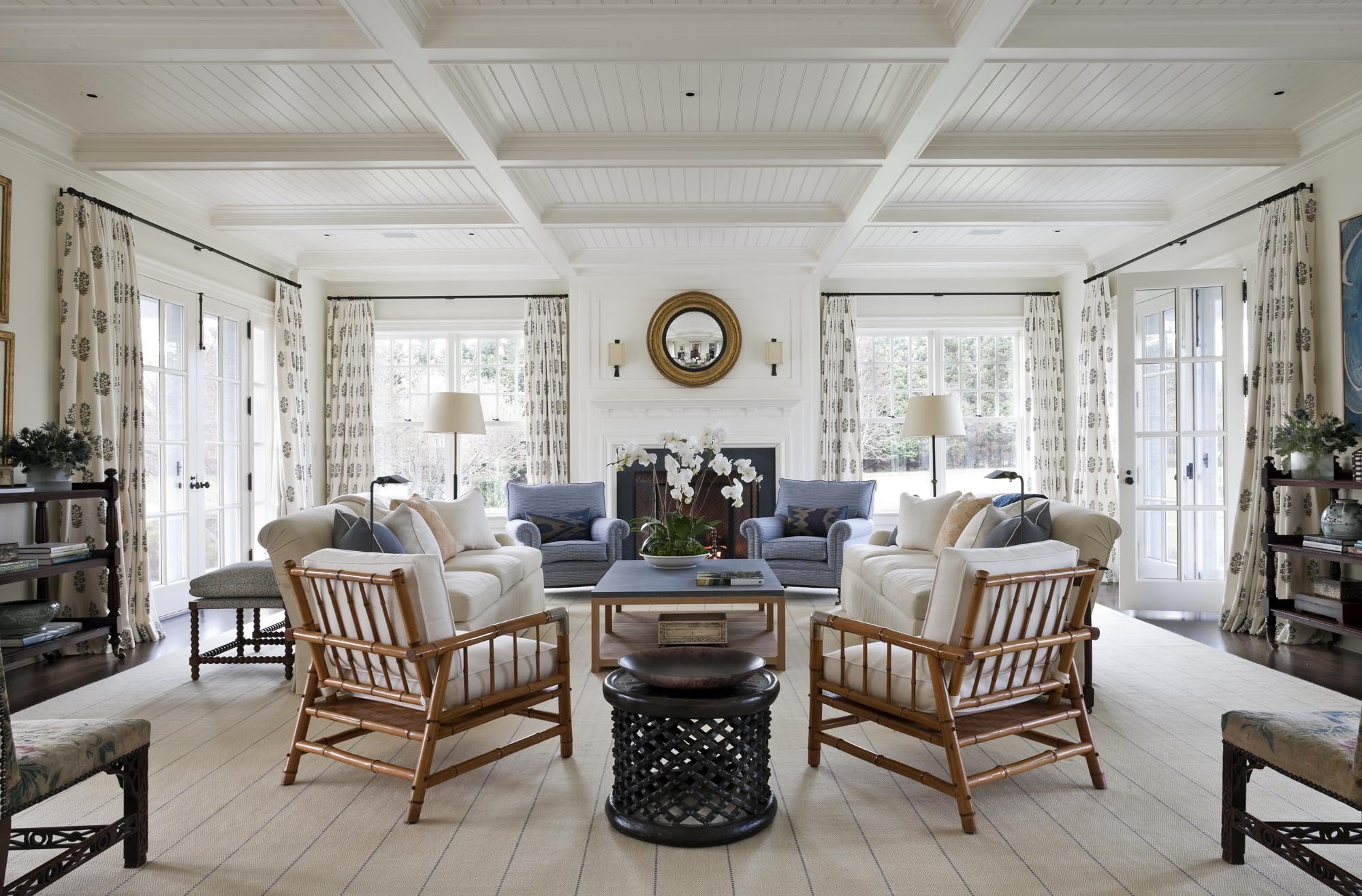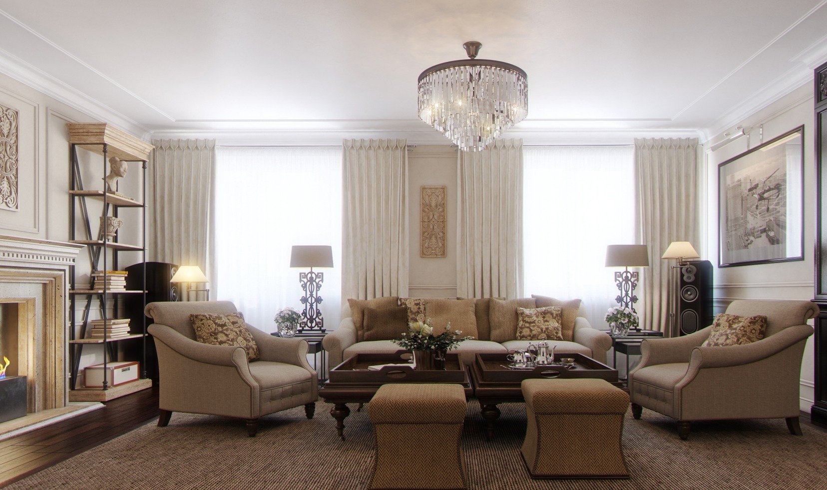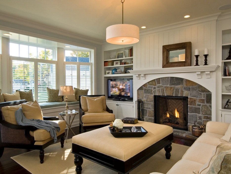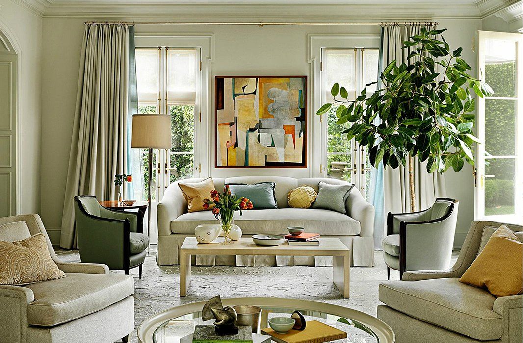Es necesario equipar la sala de estar para que siga siendo cómoda, luminosa y espaciosa.El papel principal lo desempeñan los muebles tapizados masivos, que se ubican mejor en la parte central de la habitación cerca de la chimenea o un gran panel de televisión. Sillones y un sofá se concentran alrededor de una mesa de café en miniatura. Se mantiene una distancia bastante seria entre los objetos. En lugar de sillas suaves, se pueden usar análogos de mimbre desde los auriculares. Los dispositivos técnicos, una biblioteca, elementos decorativos se encuentran en nichos especialmente equipados. Las superficies horizontales generalmente están libres de decoración y artilugios. En el interior, el uso de grandes armarios o bastidores es inaceptable.