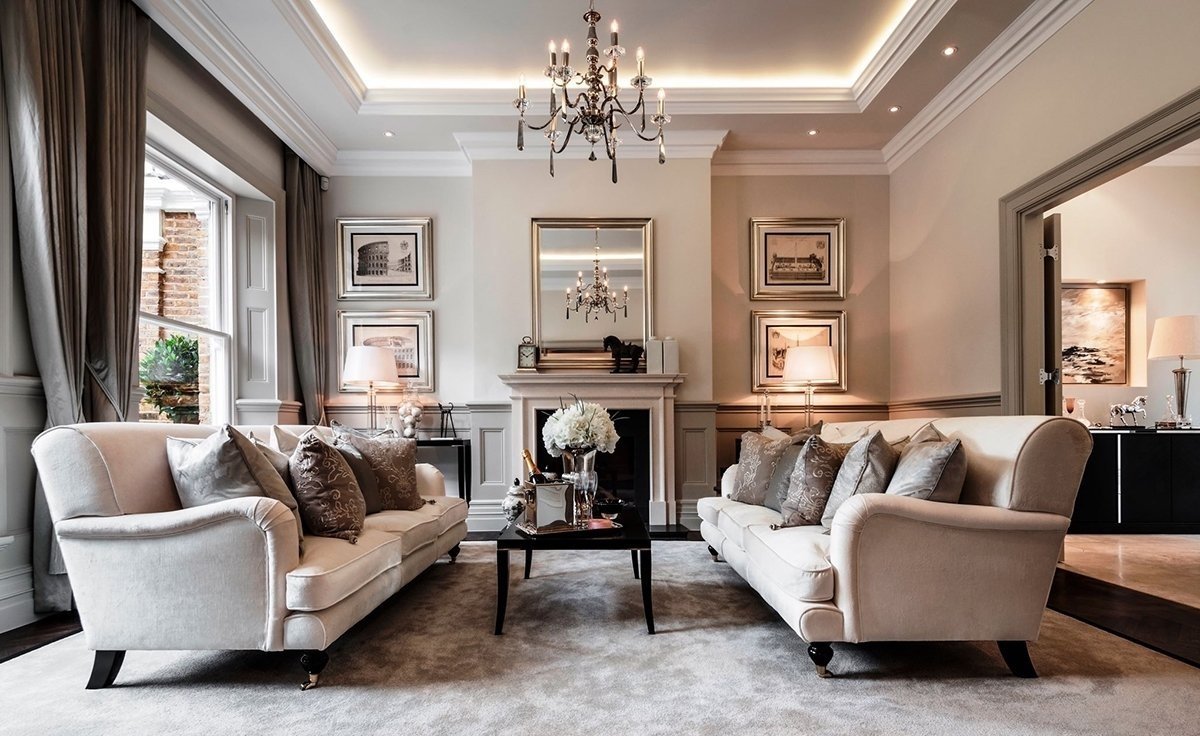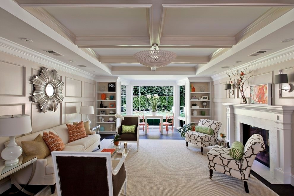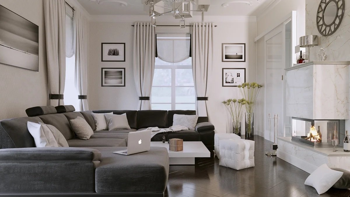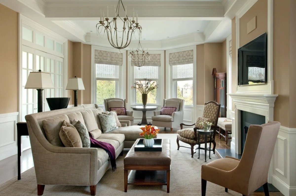 Un rasgo característico de la dirección moderna es una combinación de funcionalidad y confort. Los muebles cómodos de formas actuales están dispuestos de acuerdo con los principios clásicos.A pesar del predominio de los muebles modernos, el interior puede incluir elementos clásicos y art deco. La inclusión de detalles clásicos junto con elementos de alta tecnología se usa muy a menudo para crear interiores estadounidenses modernos. En la decoración, una chimenea clásica puede ser adyacente a un televisor ultramoderno, lámparas futuristas con jarrones y figuras exóticas, un mosaico de espejo con una regla de carro.