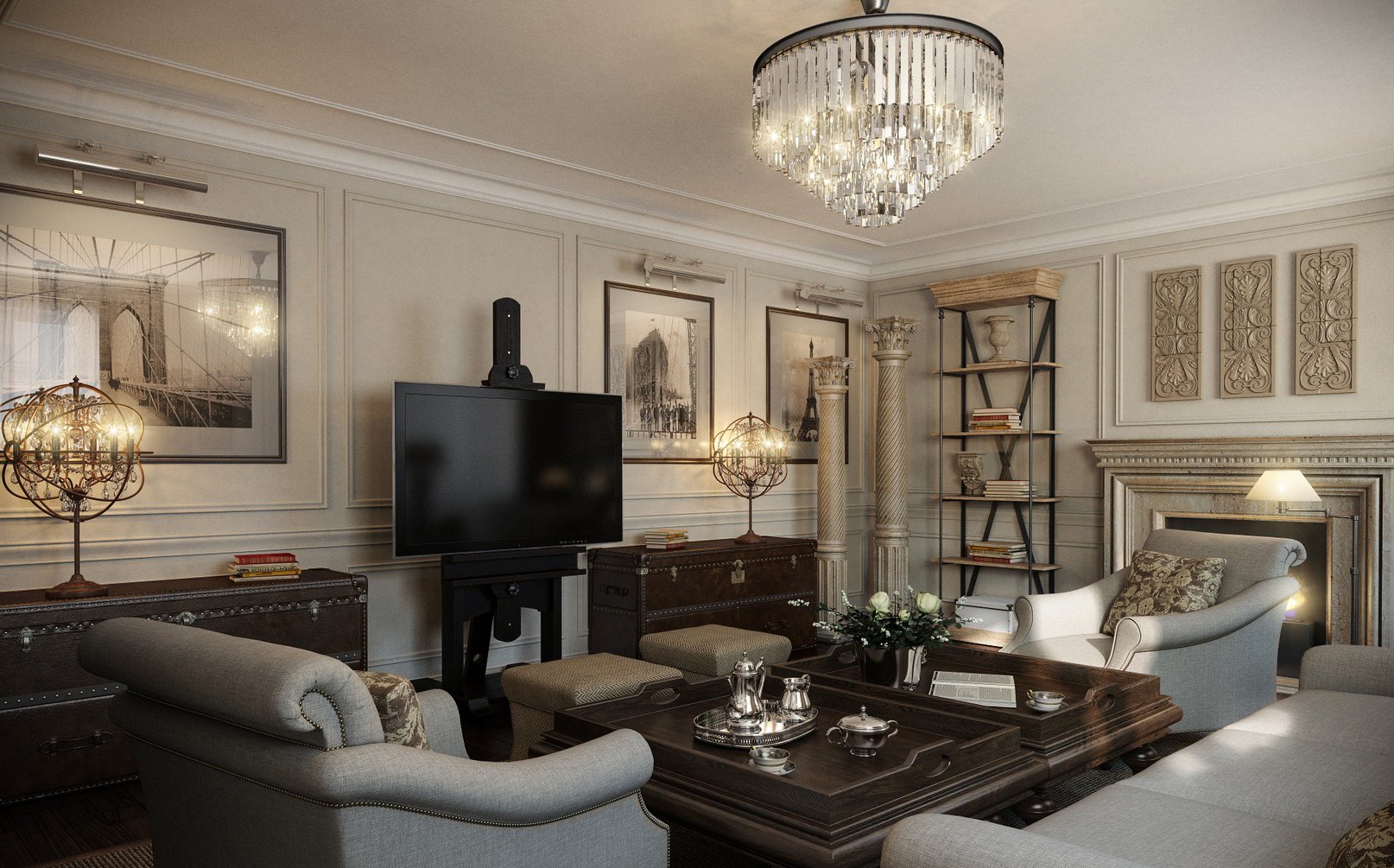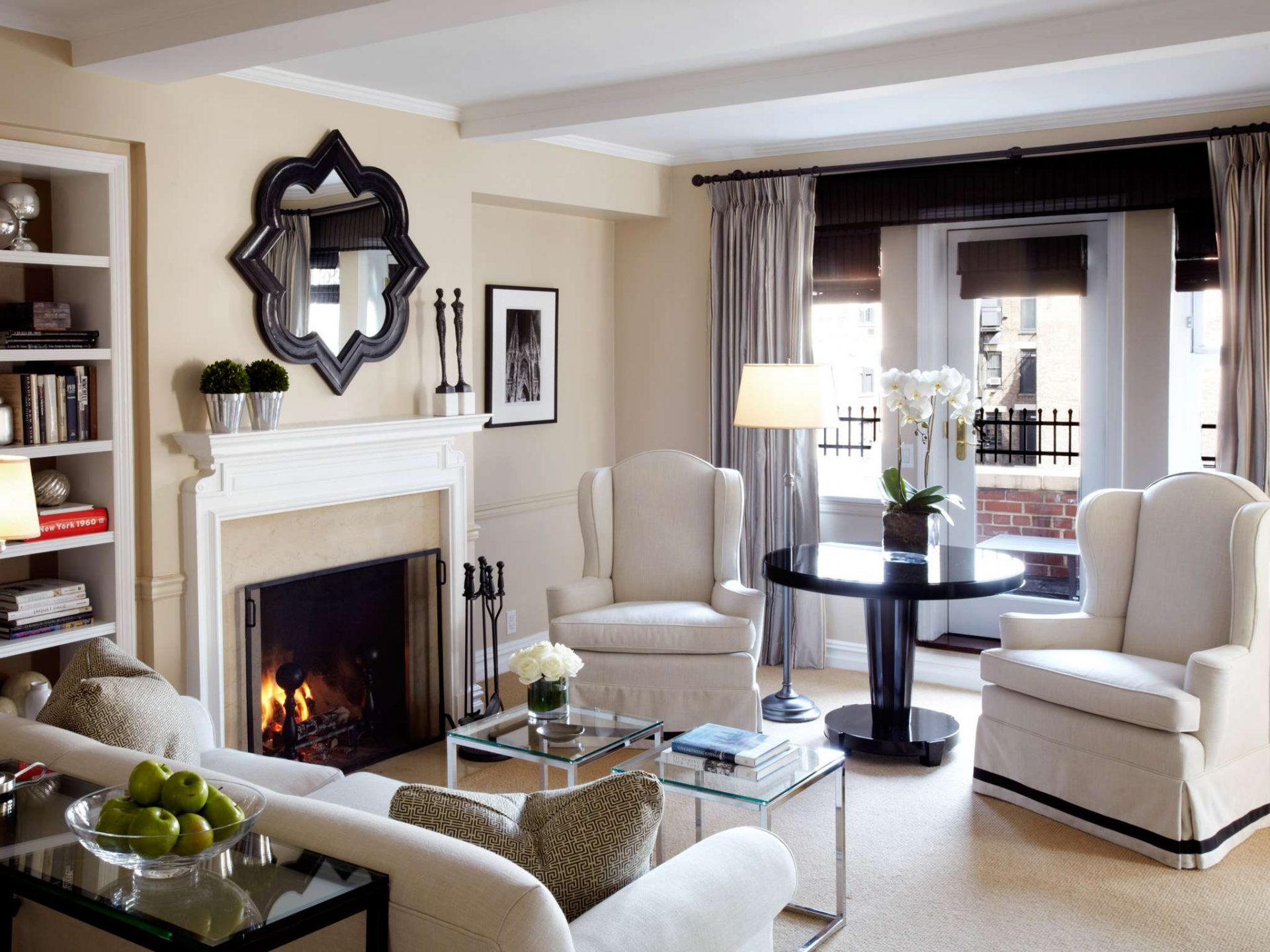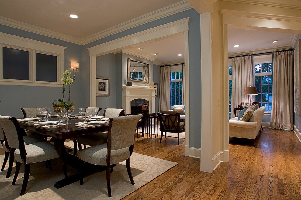 Un rasgo característico de la dirección moderna es una combinación de funcionalidad y confort. Los muebles cómodos de formas actuales están dispuestos de acuerdo con los principios clásicos.A pesar del predominio de los muebles modernos, el interior puede incluir elementos clásicos y art deco. La inclusión de detalles clásicos junto con elementos de alta tecnología se usa muy a menudo para crear interiores estadounidenses modernos. En la decoración, una chimenea clásica puede ser adyacente a un televisor ultramoderno, lámparas futuristas con jarrones y figuras exóticas, un mosaico de espejo con una regla de carro.