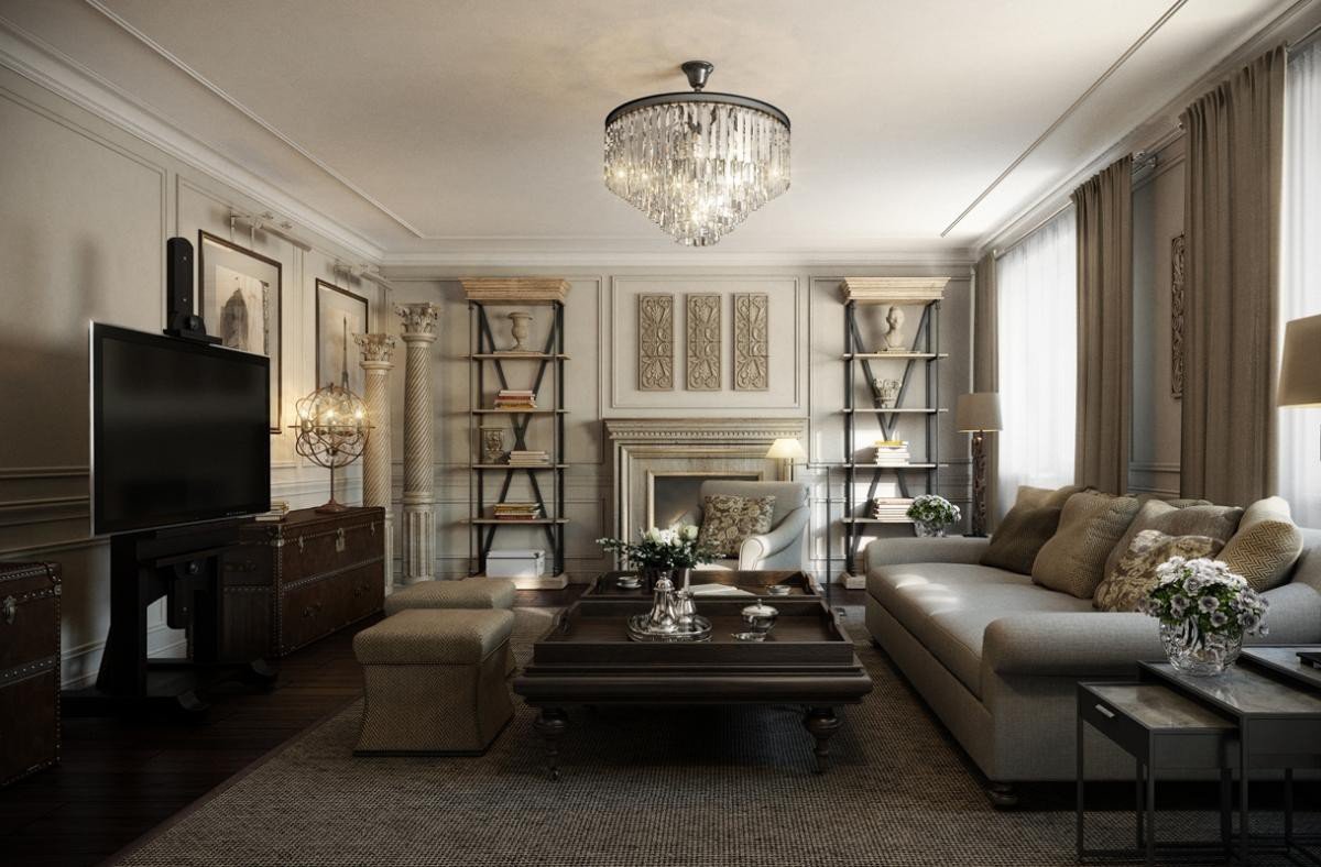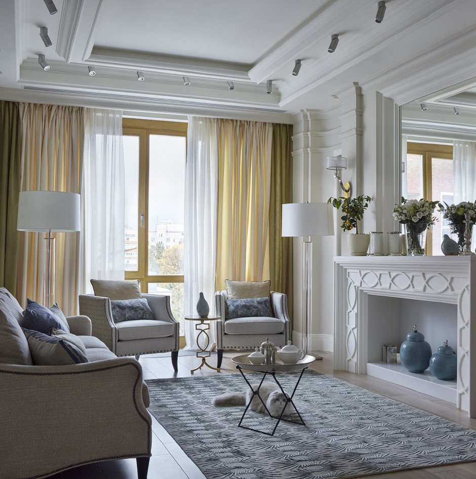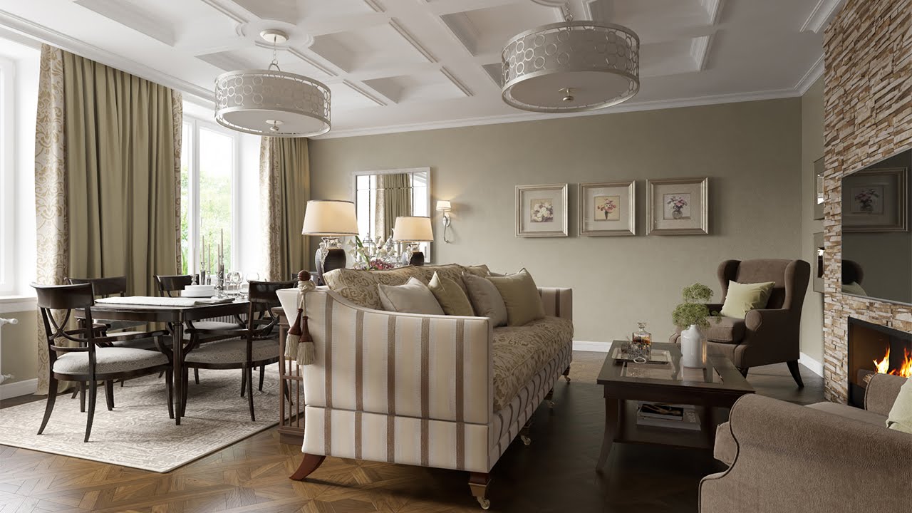 La característica principal de tales interiores es la sofisticada simplicidad y elegancia, y la conocida flexibilidad. Aquí, la tecnología moderna y los materiales de construcción innovadores se llevan bien con los principios clásicos de la formación espacial. En el diseño, la presencia de molduras de plástico, productos textiles de materiales mixtos, la imitación de una chimenea es bastante aceptable.