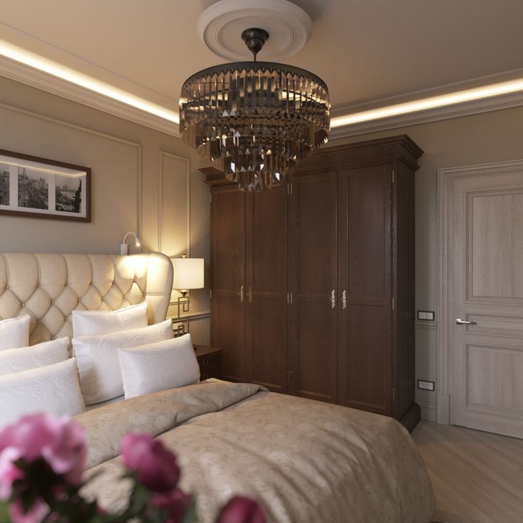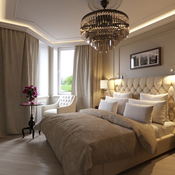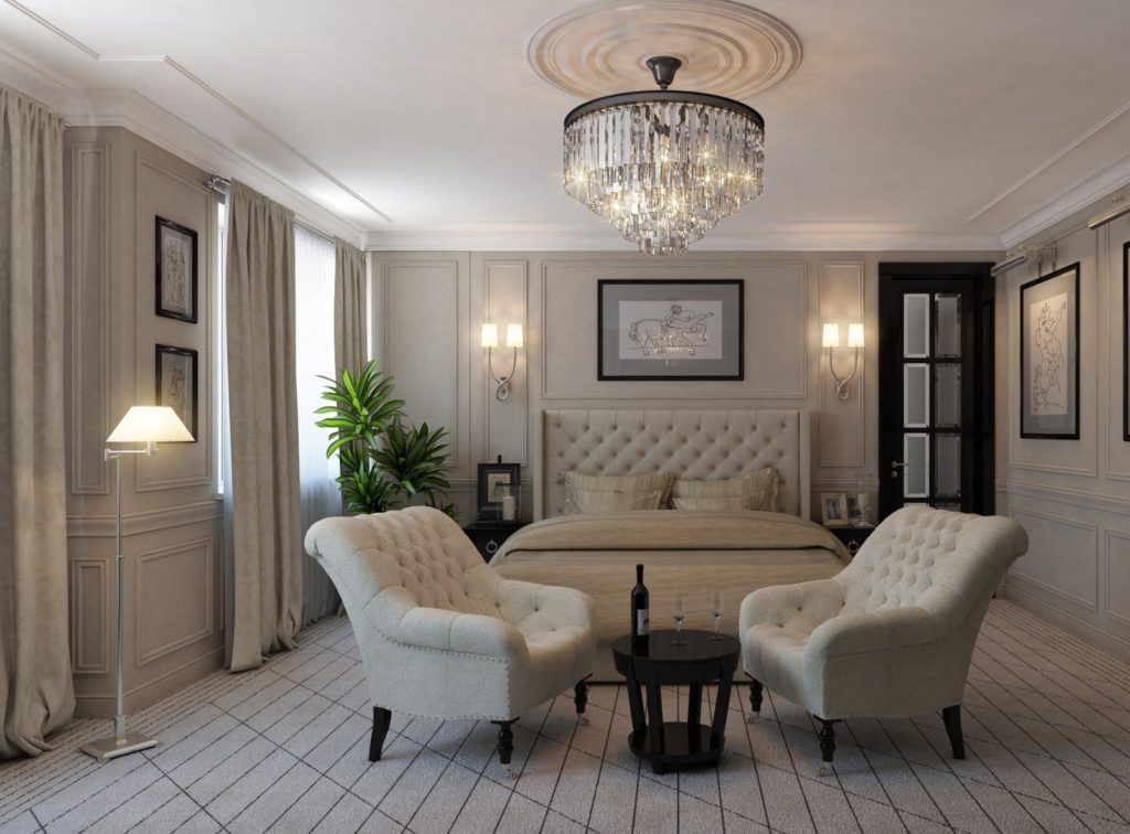 Las habitaciones pueden combinar clásico y país.Hay un impresionante mobiliario general, colores pastel claros y textiles acogedores. Para la litera se caracteriza por la presencia de una cabecera alta y banquetes en las piernas. A ambos lados de la cabecera hay dos mesitas de noche, equipadas con cajones y lámparas: mesa o apliques. Para colocar ropa de cama y ropa, vale la pena proporcionar una cómoda y, si el espacio lo permite, un amplio armario o vestidor. Las sillas de mimbre y las camas de metal se adaptan orgánicamente a los interiores modernos.