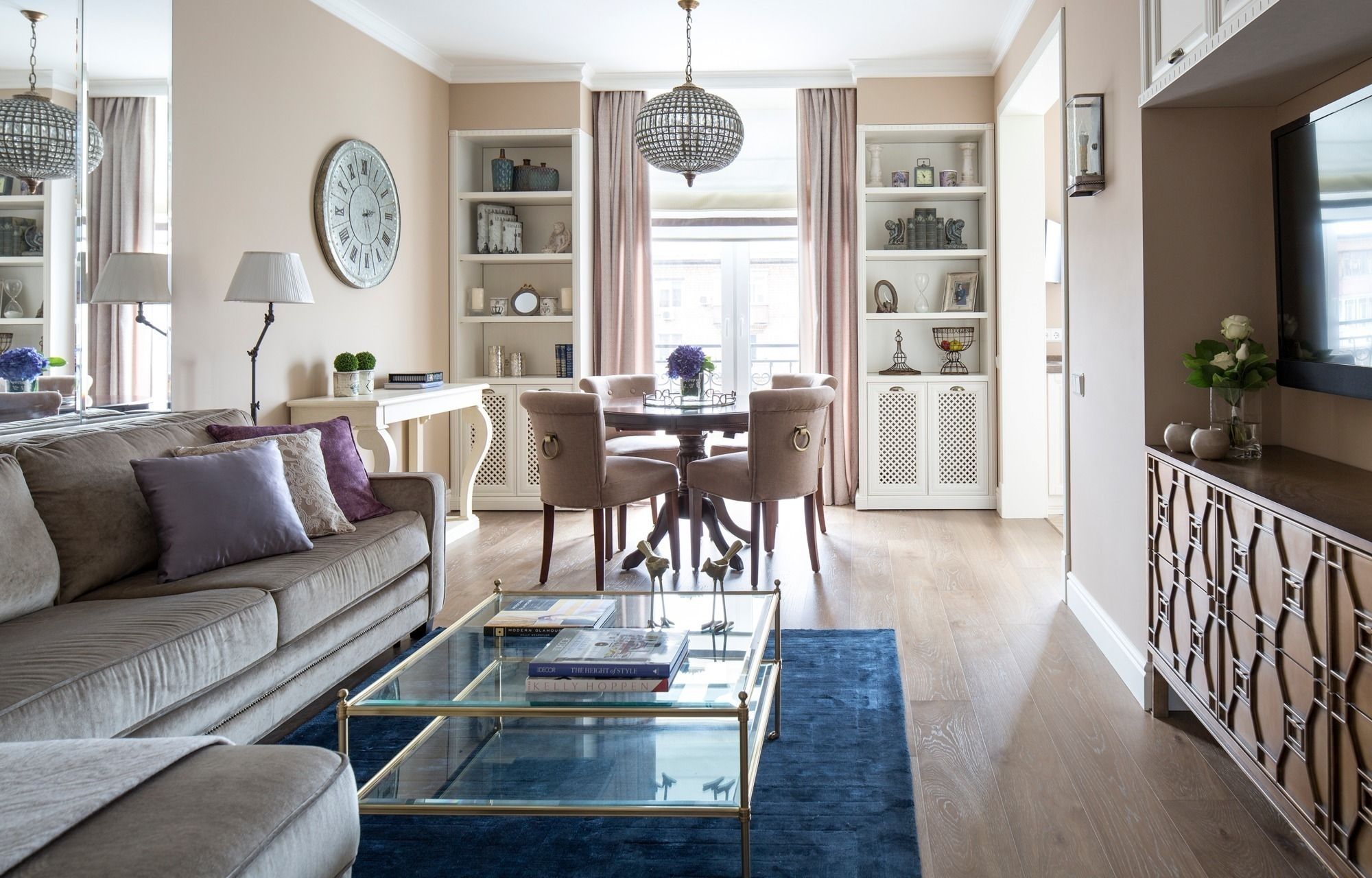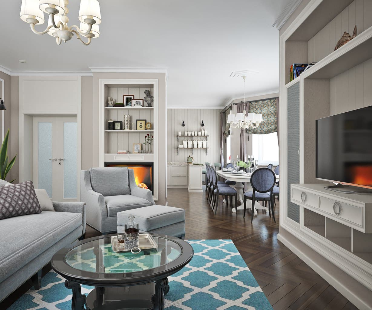 Cada zona debe tener su propia iluminación local. Se puede colocar una lámpara de araña grande sobre la mesa del comedor.