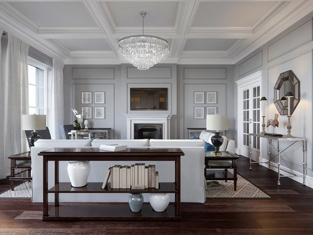 Una de las características del interior estadounidense es el aparente alto costo. Aquí las imitaciones de materiales naturales se establecen con mayor frecuencia que la piedra real, sólida, cerámica. Los acabados populares son una variedad de baguettes, molduras y cornisas. Pueden ser de cualquier color y deben parecer bastante masivos. Cubren los lugares de cualquier unión, transiciones de un material a otro, dibujan portales de puertas.