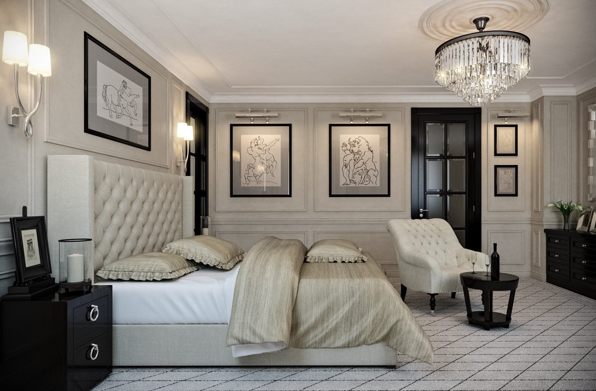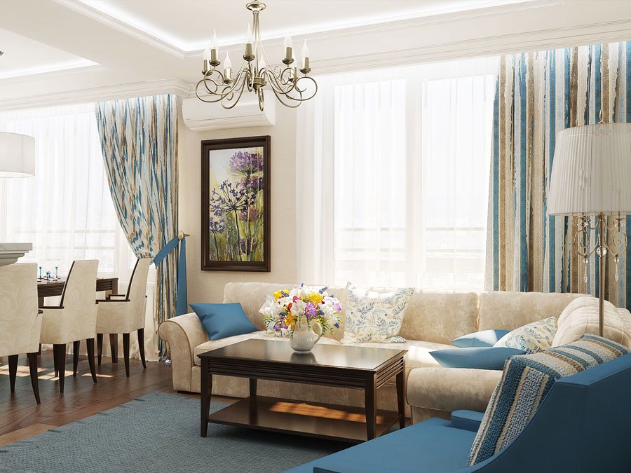 La habitación puede tener tonos azules y carmesí. Gran decoración en color dorado o metal. Estos colores se combinan perfectamente con la paleta de estilo base. El interior también acepta combinaciones contrastantes:
